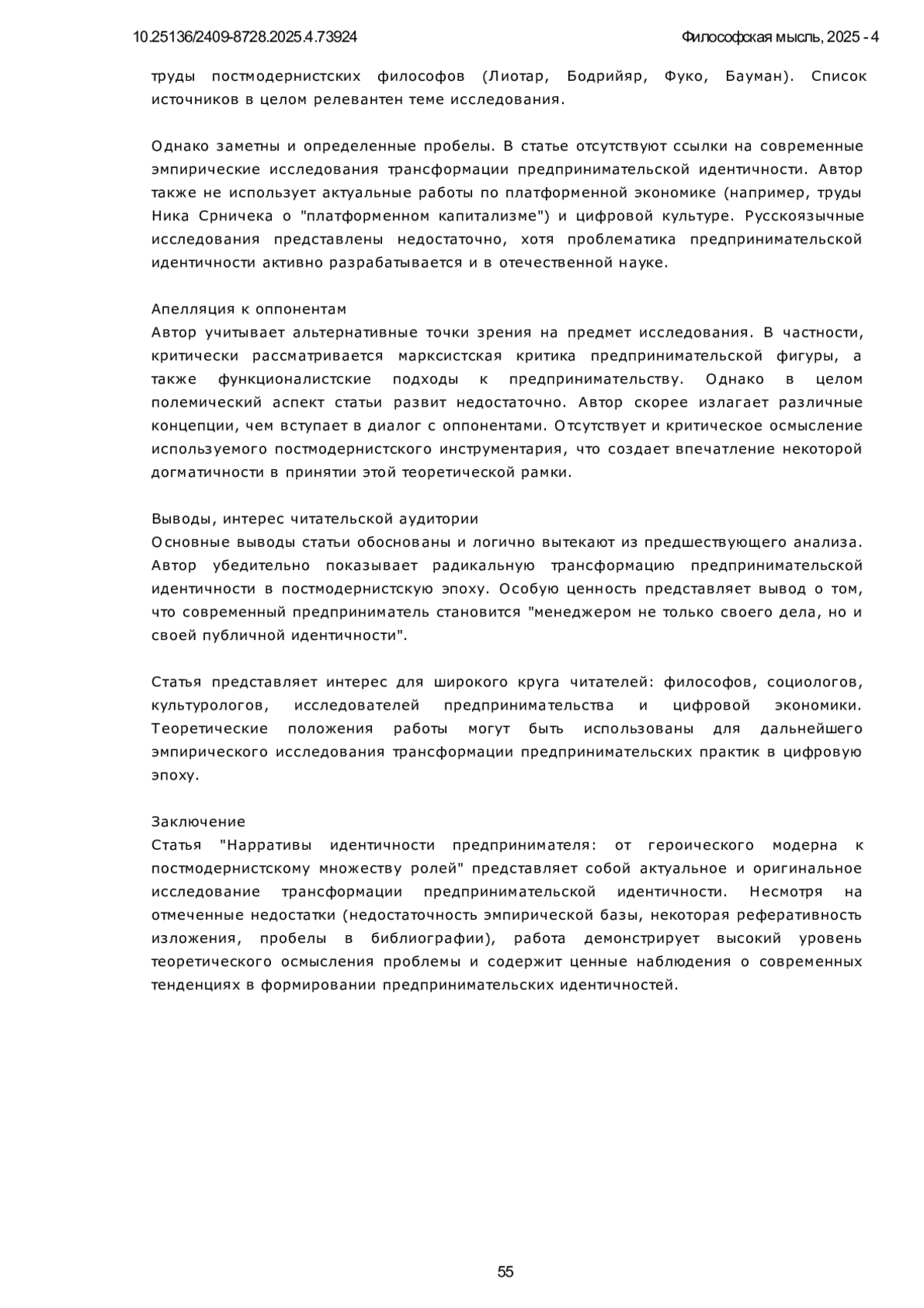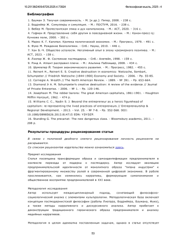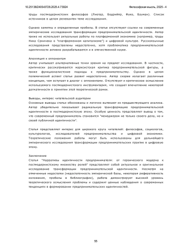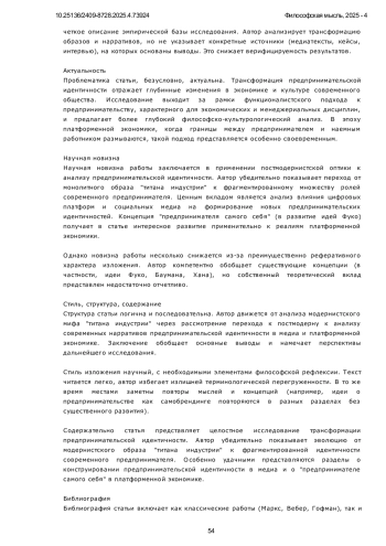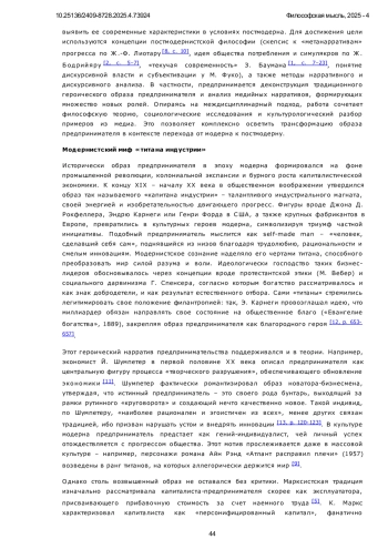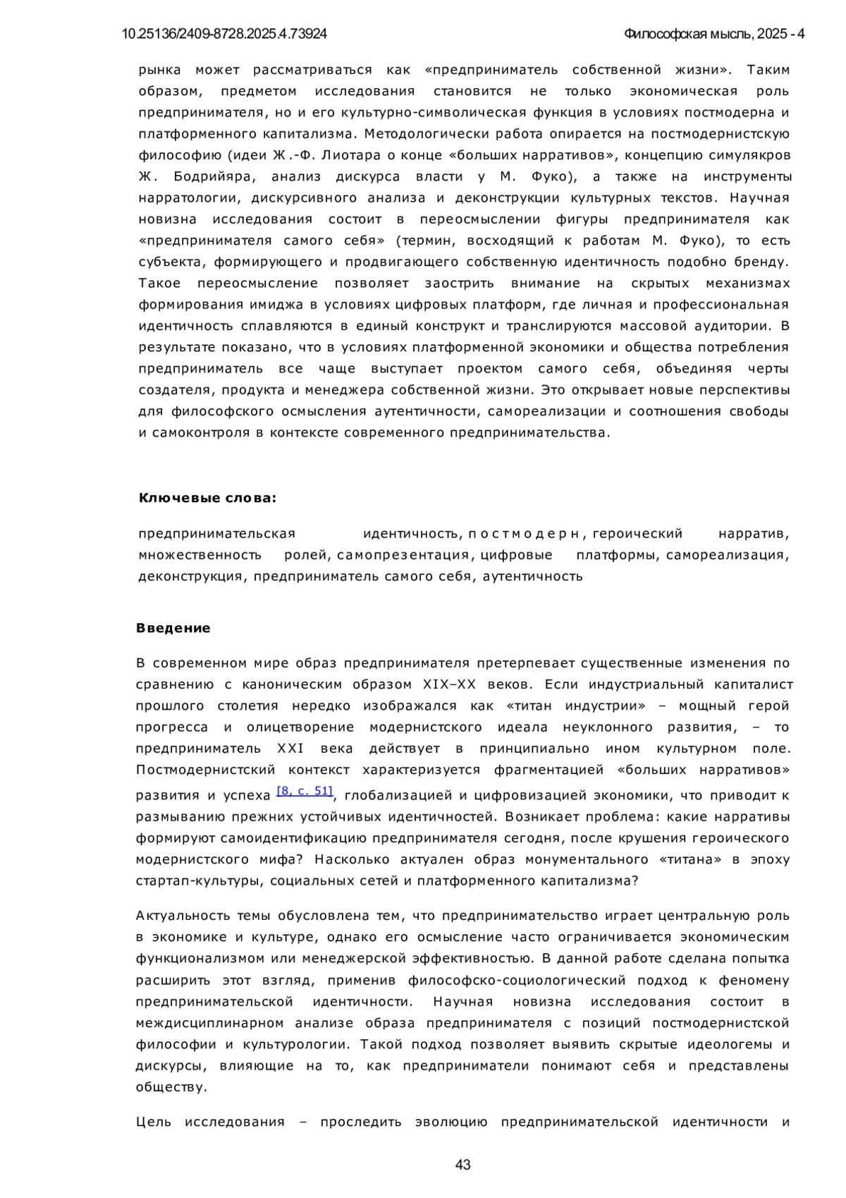 Данная статья исследует эволюцию идентичности предпринимателя от героического образа «титана индустрии» эпохи модерна к множественности ролей постмодерна. Центральная идея заключается в том, что если в модерне предприниматель представлялся как единичный герой прогресса, то в постмодернистском контексте его идентичность фрагментируется и перестраивается через различные нарративы. Современный предприниматель не только разрабатывает технологические решения или управляет компаниями, но и активно конструирует публичный образ с помощью СМИ и соцсетей, превращаясь в «бренд» самого себя. Переосмысление предпринимательства в таком ключе затрагивает вопросы аутентичности, самопрезентации и влияния цифровых платформ, где каждый участник рынка может рассматриваться как «предприниматель собственной жизни». Таким образом, предметом исследования становится не только экономическая роль предпринимателя, но и его культурно-символическая функция в условиях постмодерна и платформенного капитализма. Методологически работа опирается на постмодернистскую философию (идеи Ж.-Ф. Лиотара о конце «больших нарративов», концепцию симулякров Ж. Бодрийяра, анализ дискурса власти у М. Фуко), а также на инструменты нарратологии, дискурсивного анализа и деконструкции культурных текстов. Научная новизна исследования состоит в переосмыслении фигуры предпринимателя как «предпринимателя самого себя» (термин, восходящий к работам М. Фуко), то есть субъекта, формирующего и продвигающего собственную идентичность подобно бренду. Такое переосмысление позволяет заострить внимание на скрытых механизмах формирования имиджа в условиях цифровых платформ, где личная и профессиональная идентичность сплавляются в единый конструкт и транслируются массовой аудитории. В результате показано, что в условиях платформенной экономики и общества потребления предприниматель все чаще выступает проектом самого себя, объединяя черты создателя, продукта и менеджера собственной жизни. Это открывает новые перспективы для философского осмысления аутентичности, самореализации и соотношения свободы и самоконтроля в контексте современного предпринимательства.