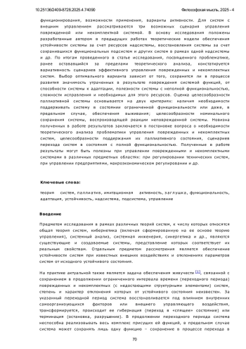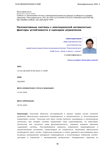 Значимой областью исследований в рамках теорий систем является проблема обеспечения живучести поврежденных и некомплектных (с отсутствующими элементами) систем. Типичным для таких систем является нахождение в паллиативном состоянии, при котором система продолжает свое существование, но утрачивает (полностью или частично) свою функциональность, сохраняя внешние признаки «здоровой» системы. Рассматриваются варианты управления поврежденными и некомплектными системами, позволяющие им сохраняться, механизмы обеспечения устойчивости таких систем. Отдельное внимание в статье уделяется рассмотрению двух основных инструментов замещения повреждённых и отсутствующих элементов систем: заглушек и элементов с имитационной активностью. Определяется характер их функционирования, возможности применения, варианты активности. Для систем с внешним управлением рассматриваются три возможных сценария управления поврежденной или некомплектной системой. В основу исследования положены разработанные автором в предыдущих работах теоретические модели обеспечения устойчивости системы за счет ресурсов надсистемы, восстановления системы за счет сохранившихся функциональных подсистем и других систем в рамках одной надсистемы и др. По итогам проведенного в статье исследования, посвященного проблематике, ранее остававшийся за пределами теоретического анализа, констатируется вариативность сценариев эффективного управления поврежденных и некомплектных систем. Выбор оптимального варианта зависит от того, сохранится ли в процессе развития значимость утраченных в результате повреждения системой функций, от способности системы к адаптации, полезности системы с неполной функциональностью, сложности исправления и необходимых для этого ресурсов. Оценка целесообразности паллиативной системы основывается на двух критериях: наличия необходимости поддерживать систему в состоянии ограниченной функциональности или даже, в предельном случае, обеспечения выживания; целесообразности номинального сохранения системы, воспроизводящей реакции неповрежденной системы. Новизна полученных в работе результатов заключается в постановке вопроса о необходимости теоретического анализа проблематики управления поврежденных и некомплектных систем, целесообразности поддержания их паллиативного состояния, сценариев перехода систем в состояния с полной функциональностью. Полученные в работе результаты могут быть полезны при управлении поврежденными и некомплектными системами в различных предметных областях: при регулировании технических систем, при управлении предприятиями, макроэкономическом регулировании и др.
