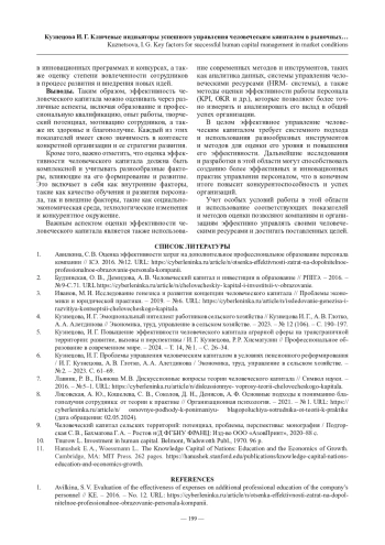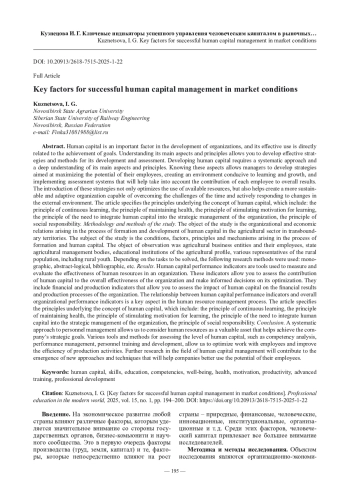 КУЗНЕЦОВА И. Г. КЛЮЧЕВЫЕ ИНДИКАТОРЫ УСПЕШНОГО УПРАВЛЕНИЯ ЧЕЛОВЕЧЕСКИМ КАПИТАЛОМ В РЫНОЧНЫХ УСЛОВИЯХ // ПРОФЕССИОНАЛЬНОЕ ОБРАЗОВАНИЕ В СОВРЕМЕННОМ МИРЕ. 2025. Т. 15, № 1