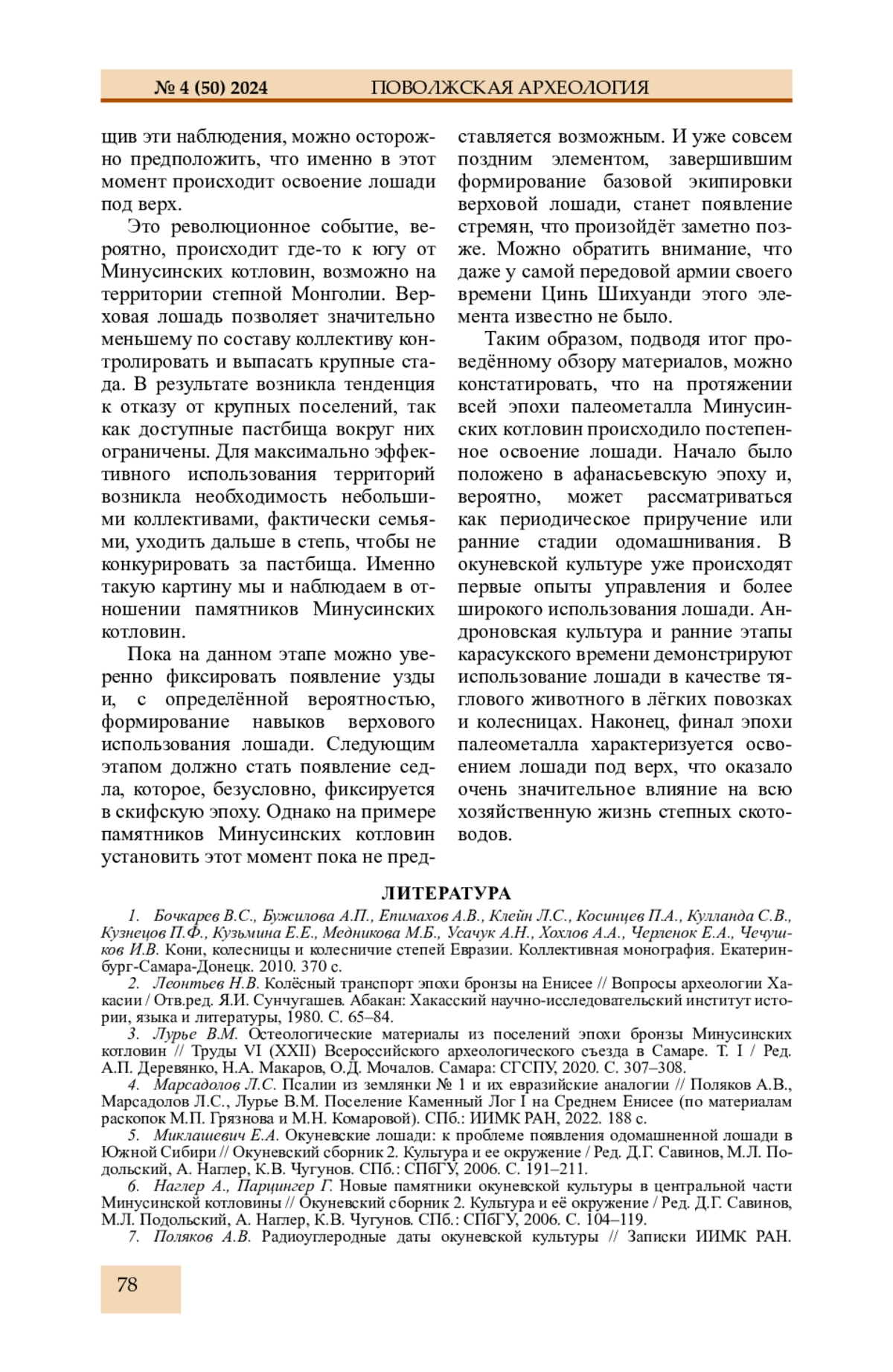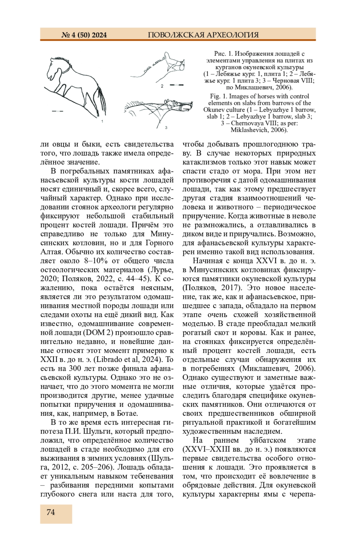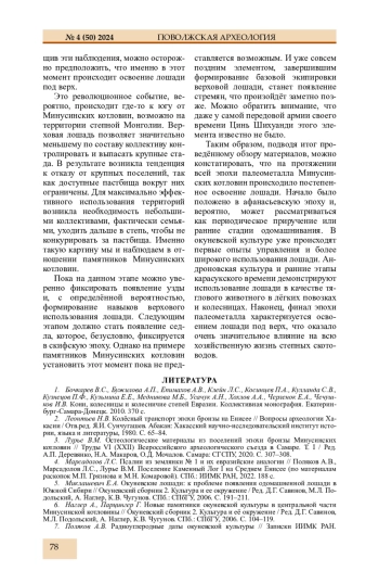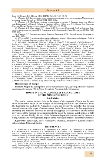 13. 	Librado P., Tressières G., Chauvey L., Fages A., Khan N., Schiavinato S., Calvière-Tonasso L., Kusliy M. A., Gaunitz C., Liu X., Wagner S., Der Sarkissian C., Seguin-Orlando A., Perdereau A., Aury J-M., Southon J., Shapiro B., Bouchez O., Donnadieu C., Collin Y., Gregersen K. M., Jessen M. D., Christensen K., Claudi-Hansen L., Pruvost M., Pucher E., Vulic H., Novak M., Rimpf A., Turk P., Reiter S., Brem G., Schwall C., Barrey E., Robert C., Degueurce C., Horwitz L. K., Klassen L., Rasmussen U., Kveiborg J., Johannsen N. N., Makowiecki D., Makarowicz P., Szeliga M., Ilchyshyn V., Rud V., Romaniszyn J., Mullin V. E., Verdugo M., Bradley D. G., Cardoso J. L., Valente M. J., Antunes M. T., Ameen C., Thomas R., Ludwig A., Marzullo M., Prato O., Gianni G. B., Tecchiati U., Granado J., Schlumbaum A., Deschler-Erb S., Mráz M. S., Boulbes N., Gardeisen A., Mayer C., Döhle H-J., Vicze M., Kosintsev P.A., Kyselý R., Peške L., O’Connor T., Ananyevskaya E., Shevnina I., Logvin A., Kovalev A.A., Iderkhangai T-O., Sablin M. V., Dashkovskiy P. K., Graphodatsky A. S., Merts I., Merts V., Kasparov A. K., Pitulko V. V., Onar V., Öztan A., Arbuckle B. S., McColl H., Renaud G., Khaskhanov R., Demidenko S., Kadieva A., Atabiev B., Sundqvist M., Lindgren G., López-Cachero F. J., Albizuri S., Vukičević T. T., Papeša A. R., Burić M., Šikanjić P. R., Weinstock J., Vilaró D. A., Codina F., Dalmau C. G., de Llorens J. M., Pou J., de Prado G., Sanmartí J., Kallala N., Torres J. R., Maraoui-Telmini B., Franco M-C. B., Valenzuela-Lamas S., Zazzo A., Lepetz S., Duchesne S., Alexeev A., Bayarsaikhan J., Houle J-L., Bayarkhuu N., Turbat T., Crubézy E., Shingiray I., Mashkour M., Berezina N. Ya., Korobov D. S., Belinskiy A., Kalmykov A., Demoule J-P., Reinhold S., Hansen S., Wallner B., Roslyakova N., Kuznetsov P. F., Tishkin A. A., Wincker P., Kanne K., Outram A. & Orlando L. Widespread horse-based mobility arose around 2,200 BCE in Eurasia // Nature (2024). DOI: 10.1038/s41586-024-07597-5