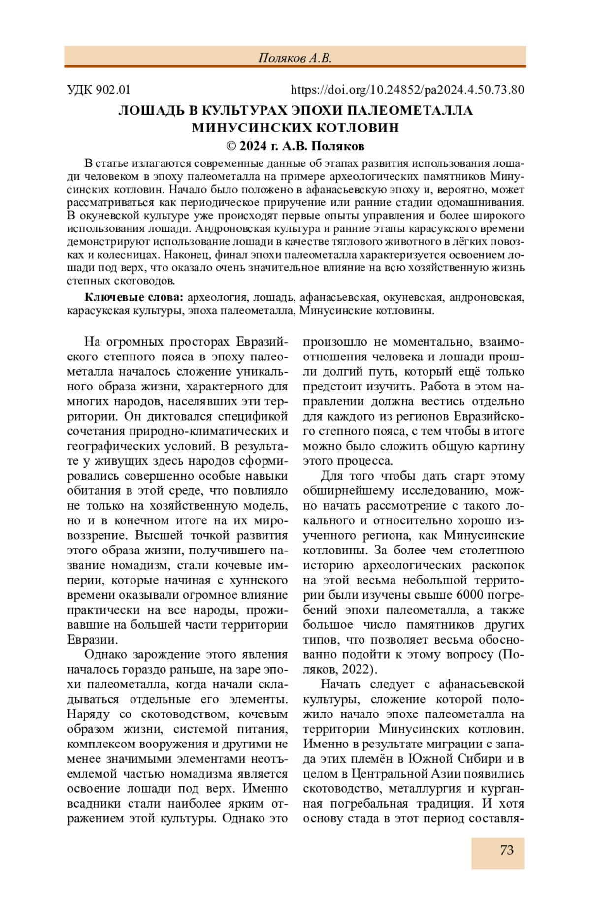 В статье излагаются современные данные об этапах развития использования лошади человеком в эпоху палеометалла на примере археологических памятников Минусинских котловин. Начало было положено в афанасьевскую эпоху и, вероятно, может рассматриваться как периодическое приручение или ранние стадии одомашнивания. В окуневской культуре уже происходят первые опыты управления и более широкого использования лошади. Андроновская культура и ранние этапы карасукского времени демонстрируют использование лошади в качестве тяглового животного в лёгких повозках и колесницах. Наконец, финал эпохи палеометалла характеризуется освоением лошади под верх, что оказало очень значительное влияние на всю хозяйственную жизнь степных скотоводов.