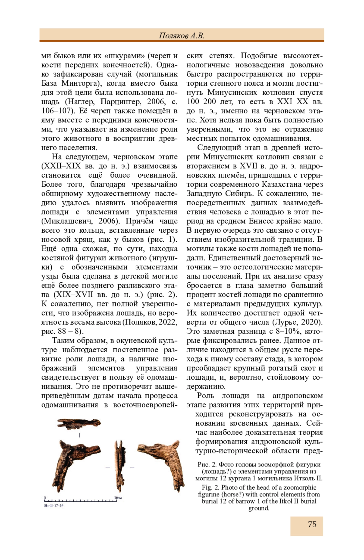 На следующем, черновском этапе (XXII–XIX вв. до н. э.) взаимосвязь становится ещё более очевидной. Более того, благодаря чрезвычайно обширному художественному наследию удалось выявить изображения лошади с элементами управления (Миклашевич, 2006). Причём чаще всего это кольца, вставленные через носовой хрящ, как у быков (рис. 1). Ещё одна схожая, по сути, находка костяной фигурки животного (игрушки) с обозначенными элементами узды была сделана в детской могиле ещё более позднего разливского этапа (XIX–XVII вв. до н. э.) (рис. 2). К сожалению, нет полной уверенности, что изображена лошадь, но вероятность весьма высока (Поляков, 2022, рис. 88 – 8).