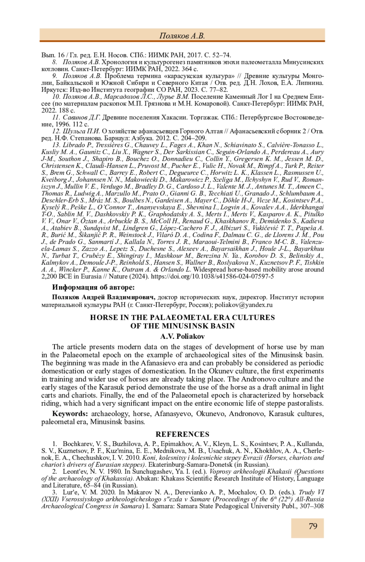 9. 	Поляков А.В. Проблема термина “карасукская культура” // Древние культуры Монголии, Байкальской и Южной Сибири и Северного Китая / Отв. ред. Д.Н. Лохов, Е.А. Липнина. Иркутск: Изд-во Института географии СО РАН, 2023. C. 77-82.