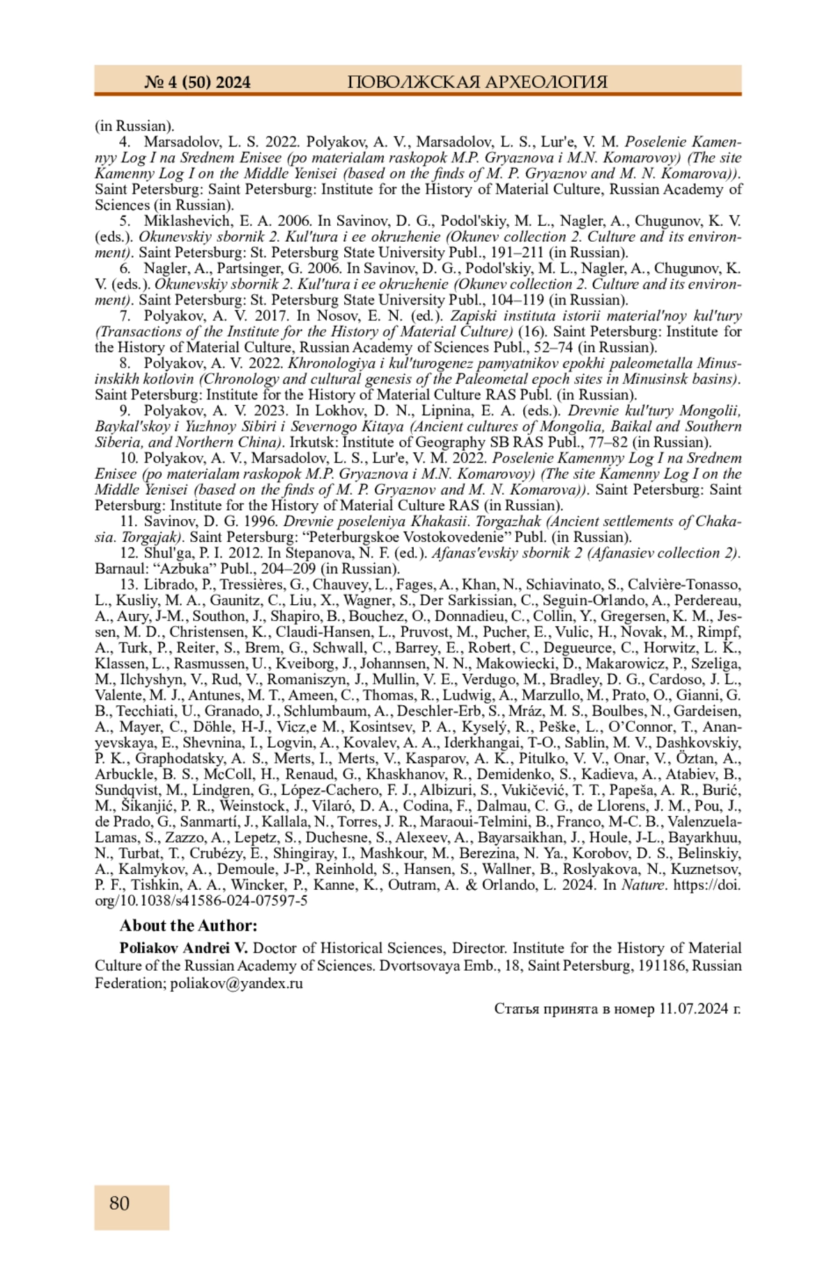8. 	Поляков А.В. Хронология и культурогенез памятников эпохи палеометалла Минусинских котловин. Санкт-Петербург: ИИМК РАН, 2022. 364 с. EDN: EVAOGE