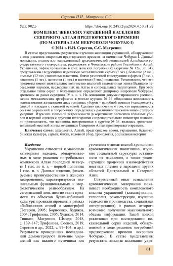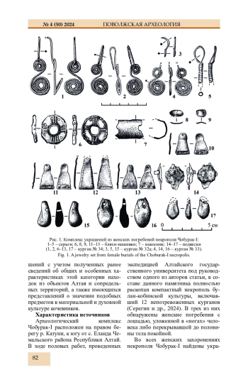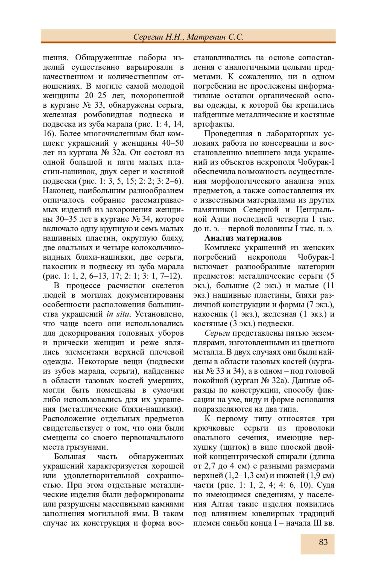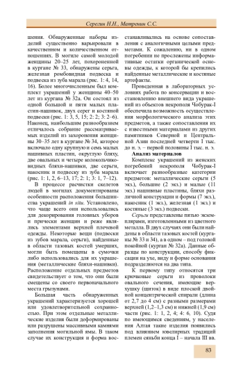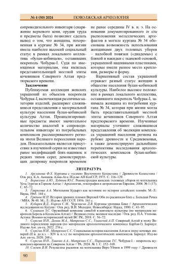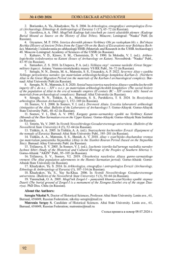 9. Серегин Н.Н., Тишкин А.А., Матренин С.С., Паршикова Т.С. Чобурак-I - некрополь жужанского времени на Северном Алтае // Российская археология. 2024. № 1. С. 152-169.