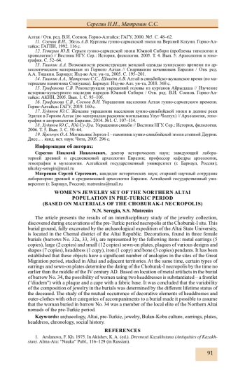 16. Трифанова С.В., Соенов В.И. Украшения населения Алтая гунно-сарматского времени. Горно-Алтайск: ГАГУ, 2019. 160 с. EDN: MJZHES
