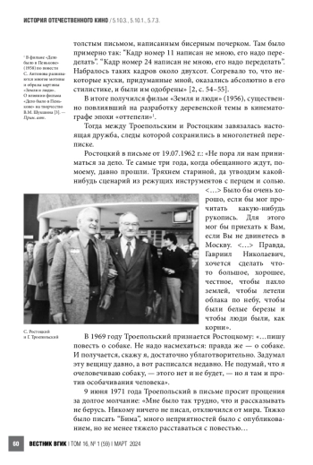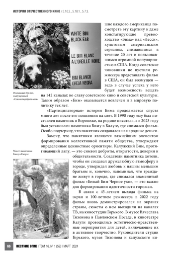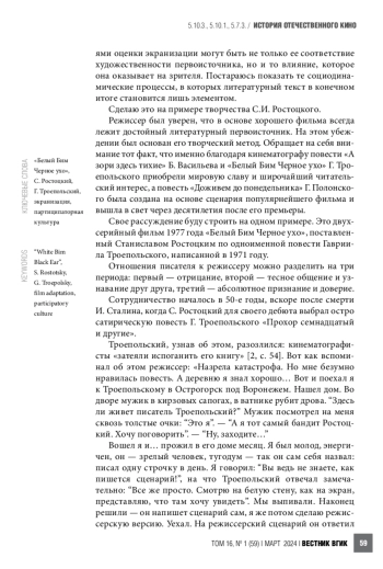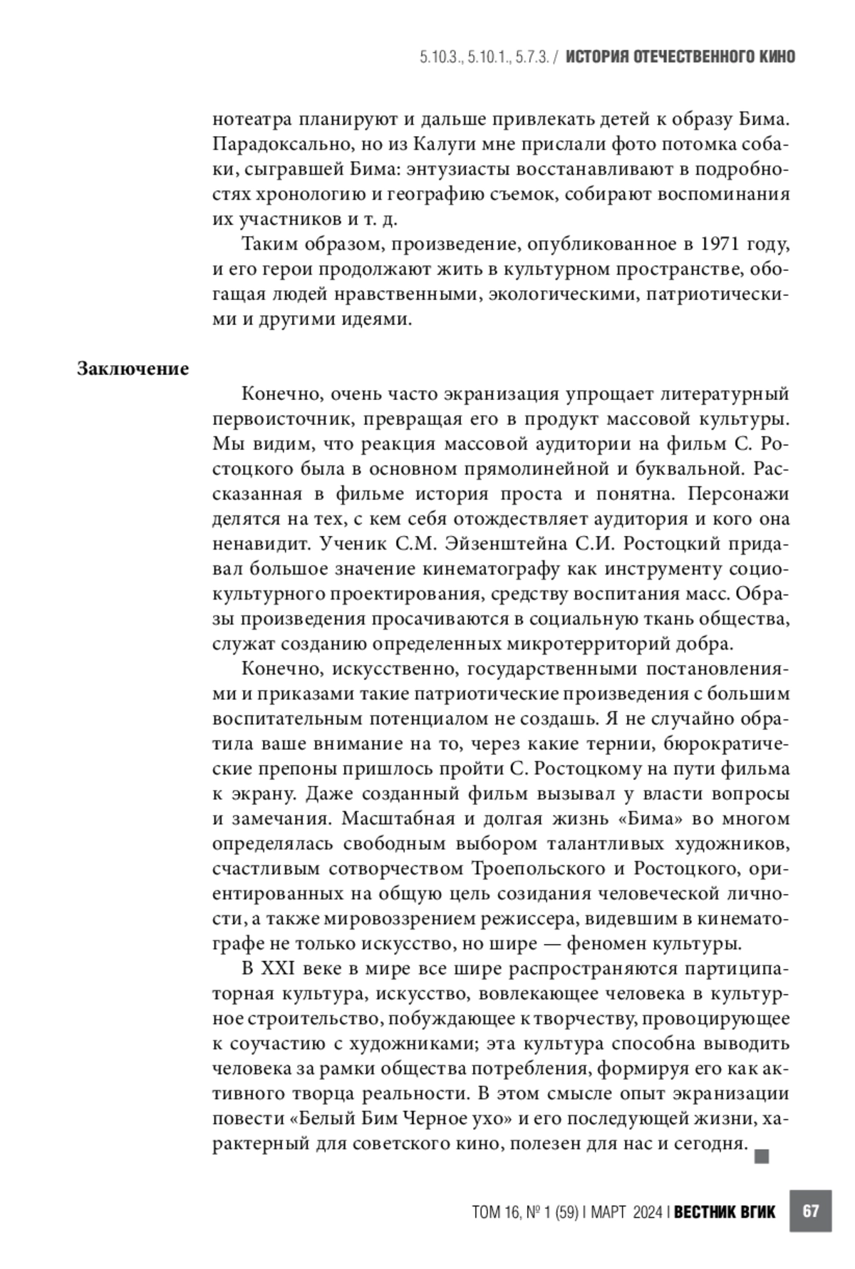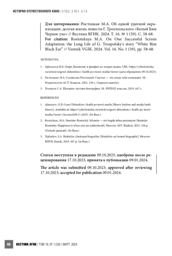 РОСТОЦКАЯ М. А. ОБ ОДНОЙ УДАЧНОЙ ЭКРАНИЗАЦИИ: ДОЛГАЯ ЖИЗНЬ ПОВЕСТИ Г. ТРОЕПОЛЬСКОГО «БЕЛЫЙ БИМ ЧЕРНОЕ УХО» // ВЕСТНИК ВГИК. 2024. ТОМ 16, №1 (59)