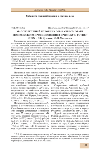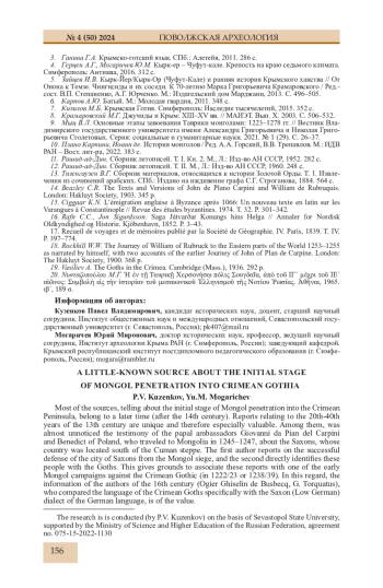 9. Мыц В.Л. Основные этапы завоевания Таврики монголами: 1223-1278 гг. // Вестник Владимирского государственного университета имени Александра Григорьевича и Николая Григорьевича Столетовых. Серия: социальные и гуманитарные науки. 2021. № 1 (29). С. 26-37. EDN: XTOSOG