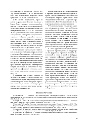 1. Котельников С. С., Гозбенко В. Е. Исследование рынка контейнерных перевозок с учетом расширения номенклатуры перевозимых грузов // Современные технологии. Системный анализ. Моделирование. 2018. № 11. С. 65-72.