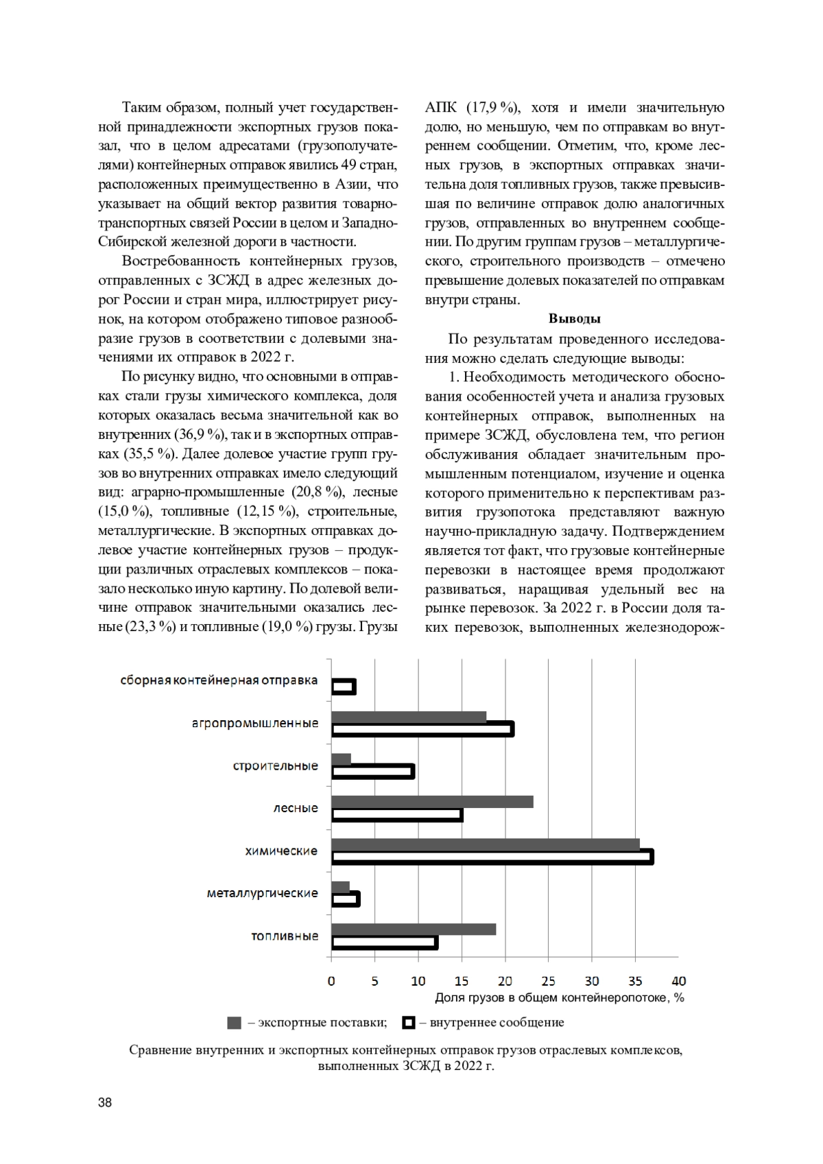 Установлено, что во внутренних контейнерных отправках наибольшая доля (36,9 %) приходится на грузы химического комплекса, перечень которых состоит из почти полутора десятков единиц. Кроме того, высокий удельный вес показали контейнерные грузы аграрно-промышленного комплекса (20,8 %), количество которых также приближается к десятку. Получателями грузов в контейнерах явились 25 железных дорог.