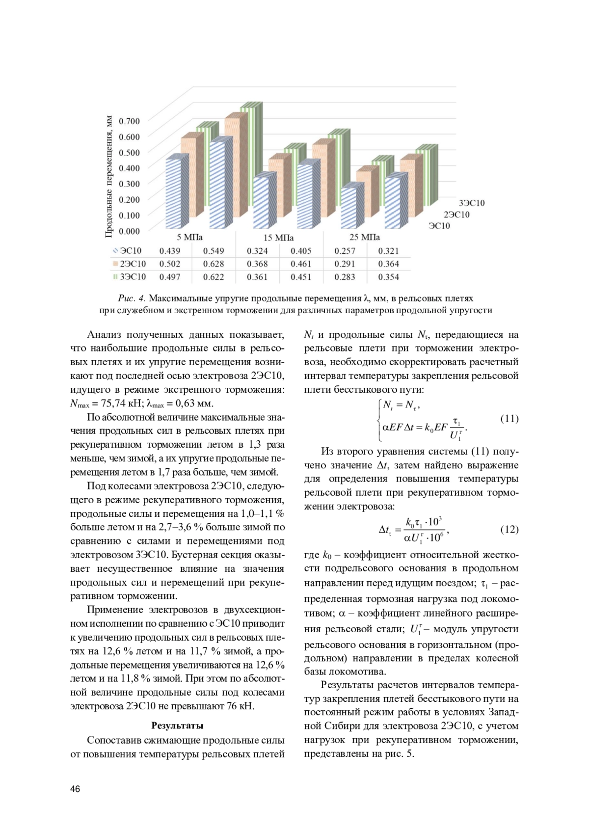 Выполнены расчеты продольных сил в рельсовых плетях и их упругих перемещений в пределах колесной базы электровозов серии ЭС10, следующих в режиме рекуперативного торможения в различных эксплуатационных условиях. Возникающие дополнительно при торможении такие продольные силы оказывают влияние на интервалы закрепления плетей бесстыкового пути и на устойчивость рельсошпальной решетки в целом.