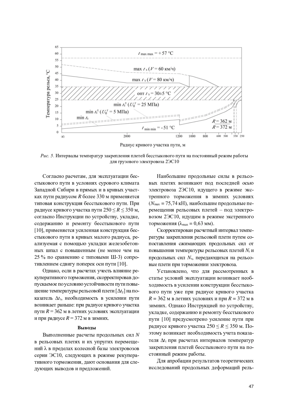 Даны предложения по корректированию расчетного интервала температуры закрепления рельсовых плетей на постоянный режим работы путем сопоставления сжимающих продольных сил от повышения температуры рельсовых плетей и продольных сил, передающихся на рельсовые плети при рекуперативном торможении электровоза. Установлено, что в рассмотренных в статье условиях необходимость усиления конструкции верхнего строения пути возникает раньше, чем это предусмотрено Инструкцией по устройству, укладке, содержанию и ремонту бесстыкового пути.