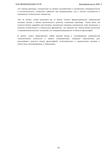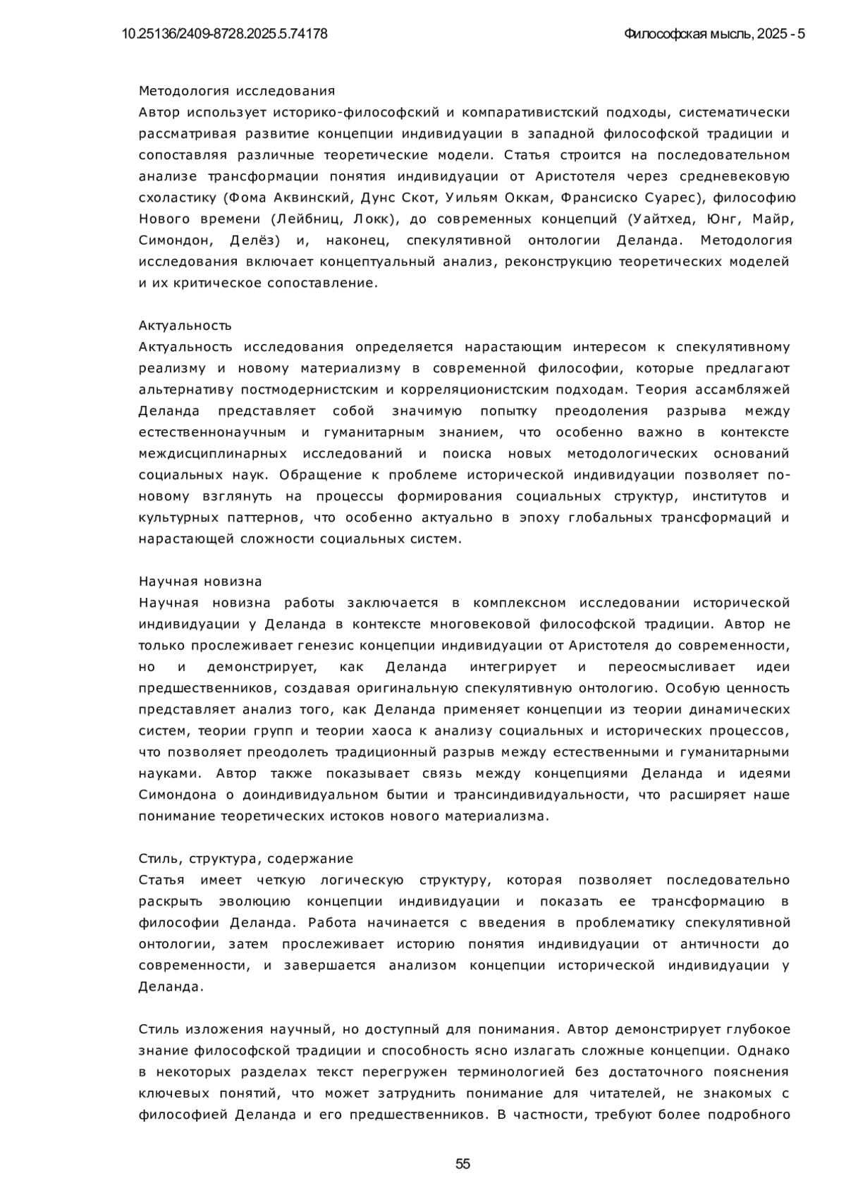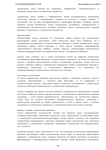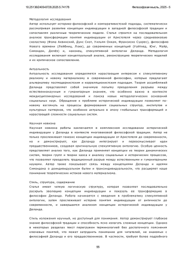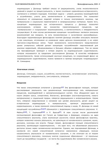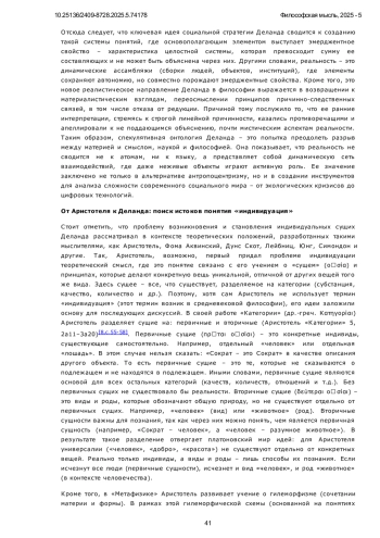 В данной работе рассматривается концепция индивидуации как исторического процесса, разработанная представителем спекулятивной онтологии и нового материализма Мануэлем Деланда. Цель данной статьи - не только переосмыслить проблему становления индивидуальных сущих (индивидов, институтов, городов и национальных государств), но и рассмотреть ее в контексте концепции «ассамбляжа» («сборки»). Иными словами, историческая индивидуация у Деланда - это концепция, описывающая процесс формирования и стабилизации социальных, культурных и материальных сущих через взаимодействие разнородных элементов в рамках социальных ассамбляжей. Деланда заимствует термин «индивидуация» у Ж. Симондона, но переосмысливает его в плоскости своей спекулятивной онтологии, объединяющей нелинейные материальные процессы, контингентность и эмерджентность. Отсюда следует, что все сущие - от молекул до городов, от бактерий до алгоритмов - существуют в одной плоскости, без иерархии. Междисциплинарный анализ исторической индивидуации у Деланды требуют отказа от редукционизма, учета множественности уровней и акцент на процессуальность, а также сочетания сравнительно-исторического, системного и сетевого подходов. Ключевая задача - уловить динамику взаимодействий в ассамбляжах, учесть роль контингентности и эмерджентности. Это позволяет отказаться от упрощенных моделей истории в пользу многомерного анализа, где материальное и социальное переплетаются в непредсказуемых паттернах. Кроме того, концепция индивидуации как исторического процесса у Деланда позволяет анализировать историю как множество переплетающихся процессов, где «материальное» и «социальное» взаимозависимы, а контингентность и эмерджентность сосуществуют. В этом случае достижением концепции «ассамбляжа» является описание взаимосвязей как внешних, то есть множественных и качественно разнообразных. Благодаря параметризации философских понятий Деланда способен описывать явления и как симуляции, отслеживая их изменения через цепочки взаимосвязей, а не через причинно-следственные связи. Такая возможность количественного представления ранее уникальных событий делает концепцию «ассамбляжей» перспективной для анализа корреляций, обнаруживаемых в больших объемах информации. Тем не менее эта трансформация приводит к потере акцента на индивидуальном существовании, которое оказывается за пределами рассмотрения Деланда. В качестве метафизики множественности, также использующей научные концепции, но сохраняющей фокус на индивидуальном существовании, можно привести в пример концепцию «индивидуации» Ж. Симондона.