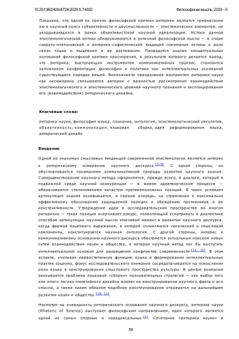 анализируется идея риторики науки - философского направления, рассматривающего роль языка в конструировании логико-методологического и смыслового пространства науки. Отмечается, что, несмотря на очевидность риторического основания научного дискурса, идея риторики науки является одной из самых спорных и парадоксальных - сочетание «риторика науки» зачастую воспринимается как оксюморон. В статье с применением герменевтической рефлексии, а также логических и аналитических методов, выработанных в рамках современной эпистемологии гуманитарных наук, анализируются концептуальные истоки данного восприятия и обозначаются возможности его преодоления. Развивается представление, согласно которому у негативного отношения к риторическим элементам в научном размышлении древняя история, уходящая корнями в различные слои философского теоретического массива. Особое внимание уделяется объективистской критике смысловой неоднозначности, прослеживается ее связь с негативной философской оценкой риторики и идеей философского реформирования естественного языка. Показано, что одной из причин философской критики риторики является привнесение ею в научный поиск субъективности и двусмысленности - эпистемических элементов, не укладывающихся в рамки объективистской научной идеализации. Истоки данной эпистемологической оптики обнаруживаются в античной философской мысли - в споре сократо-платоновской и риторико-софистической традиций понимания истины и роли связи языка и мышления в ее достижении. Проводится анализ концептуальных оснований философской критики красноречия, в результате которого делается вывод, что риторика, выступающая инструментом коммуникативных практик, становится заложником конфронтации философии и политики как интеллектуальных оснований существующего порядка вещей. Возможности преодоления восприятия риторики науки как оксюморона связываются автором с важностью рассмотрения взаимодействия эпистемологического и эпистемического уровней научного познания и эксплицирования его (взаимодействия) риторического дизайна.