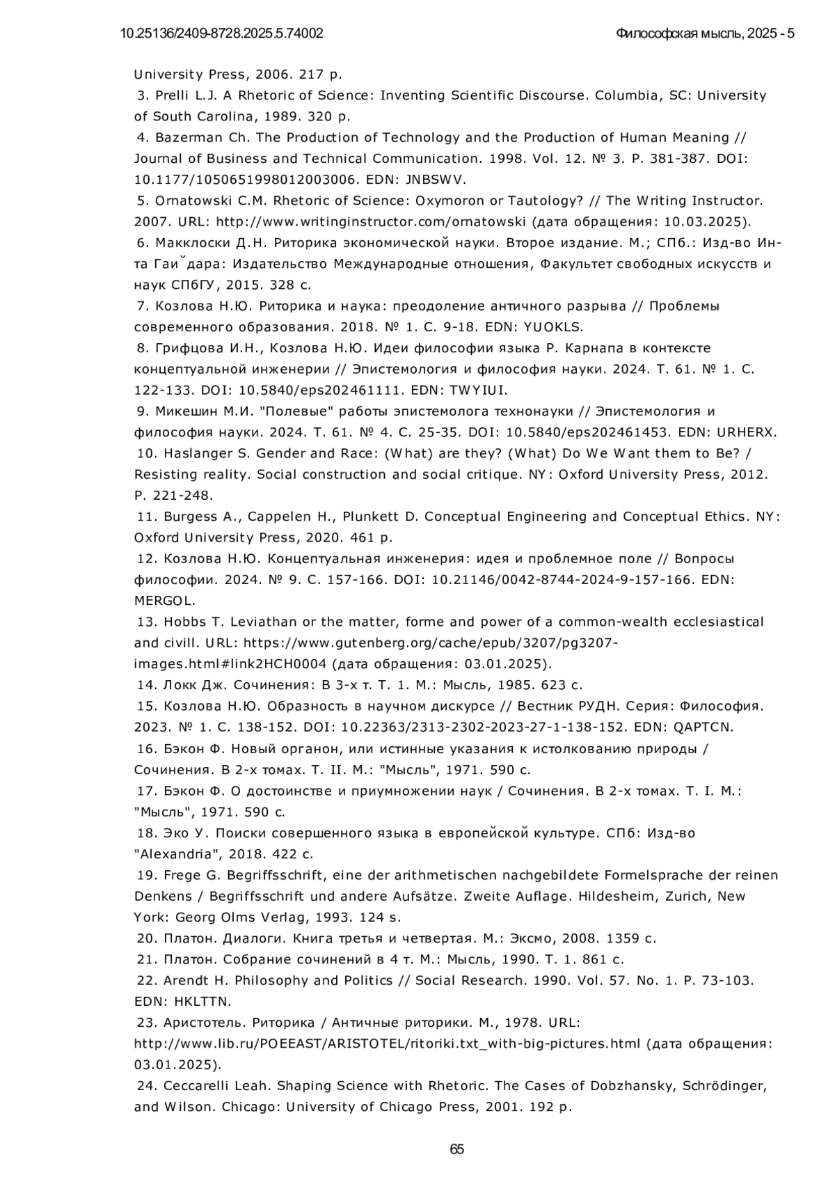 7. Козлова Н.Ю. Риторика и наука: преодоление античного разрыва // Проблемы современного образования. 2018. № 1. С. 9-18.