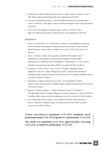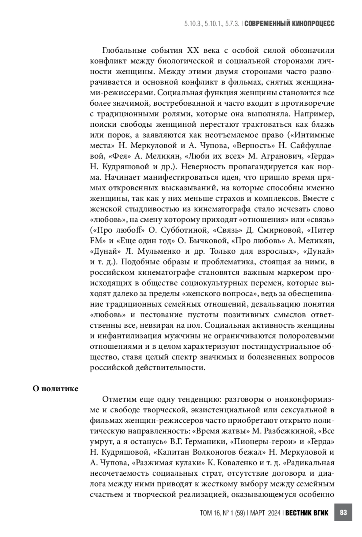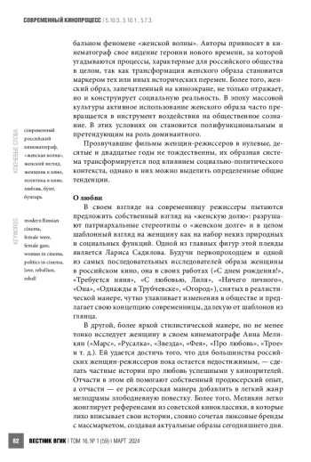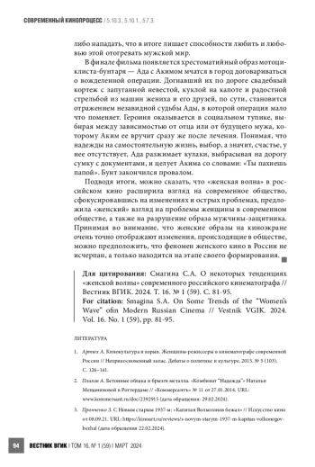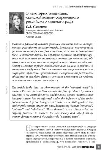 СМАГИНА С. А. О НЕКОТОРЫХ ТЕНДЕНЦИЯХ «ЖЕНСКОЙ ВОЛНЫ» СОВРЕМЕННОГО РОССИЙСКОГО КИНЕМАТОГРАФА // ВЕСТНИК ВГИК. 2024. ТОМ 16, №1 (59)