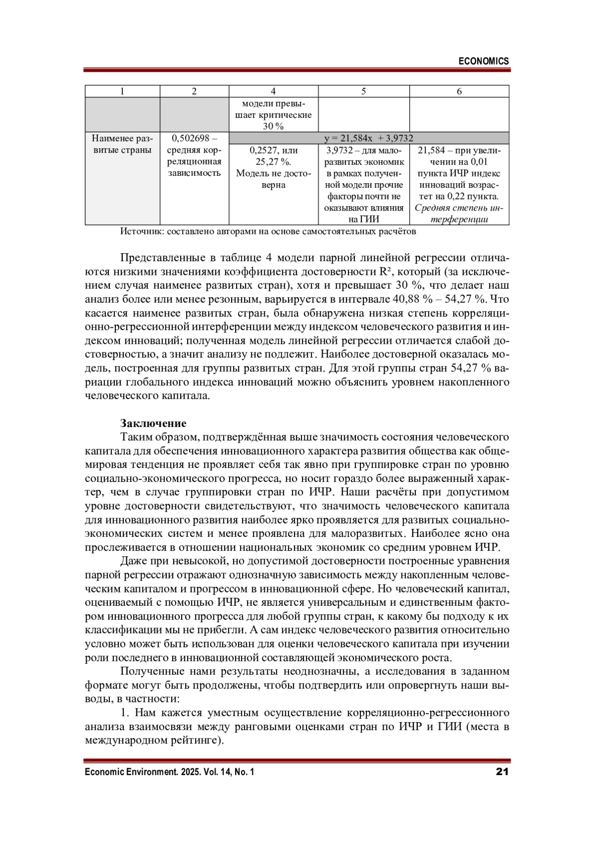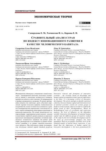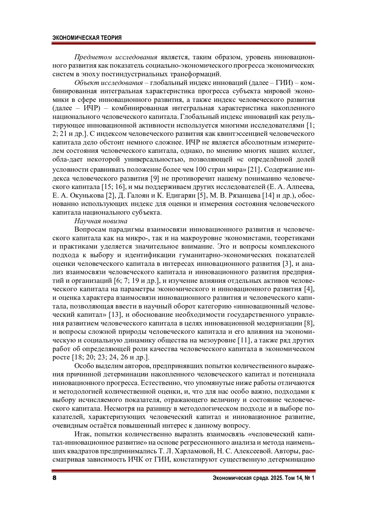 21. 	Харламова, Т. Л. Исследование взаимосвязи между человеческим капиталом и инновационным развитием / Т. Л. Харламова, Н. С. Алексеева // Социально-экономический и гуманитарный журнал. - 2021. - № 4(22). - С. 63-76.  DOI: 10.36718/2500-1825-2021-4-63-76  EDN: DNWIEZ