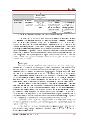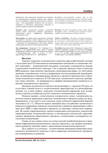 Инновационное обновление и становление «новой экономики» - инновационной экономики, экономики, основанной на знаниях и накоплении человеческого капитала, придаёт последнему особое значение. Он превращается в драйвер инновационного развития. В статье предпринята попытка для отдельных групп субъектов современной мировой экономики выявить статистическую когерентность между человеческим капиталом и уровнем инновационности национальных экономических систем, чтобы подтвердить общемировую тенденцию их взаимообусловленности. На основе методического инструментария корреляционно-регрессионного анализа количественно определён уровень влияния на зависимую переменную (инновационное развитие) состояния национального человеческого капитала для разных групп стран, ранжируемых в исследовании по уровню человеческого развития и по уровню социально-экономического прогресса. При допустимом уровне достоверности полученных моделей парной линейной регрессии обнаружено, что значимость человеческого капитала для инновационного развития наиболее ярко проявляется для развитых социально-экономических систем и менее - для малоразвитых. Наиболее ясно она прослеживается в отношении национальных экономик со средним уровнем человеческого развития.