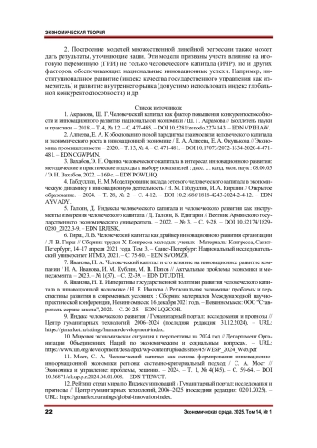 4. 	Габдуллин, Н. М. Моделирование вклада сетевого человеческого капитала в экономическую динамику и инновационную деятельность / Н. М. Габдуллин, И. А. Киршин // Открытое образование. - 2024. - Т. 28, № 2. - С. 4-12.  DOI: 10.21686/1818-4243-2024-2-4-12  EDN: AYVADY