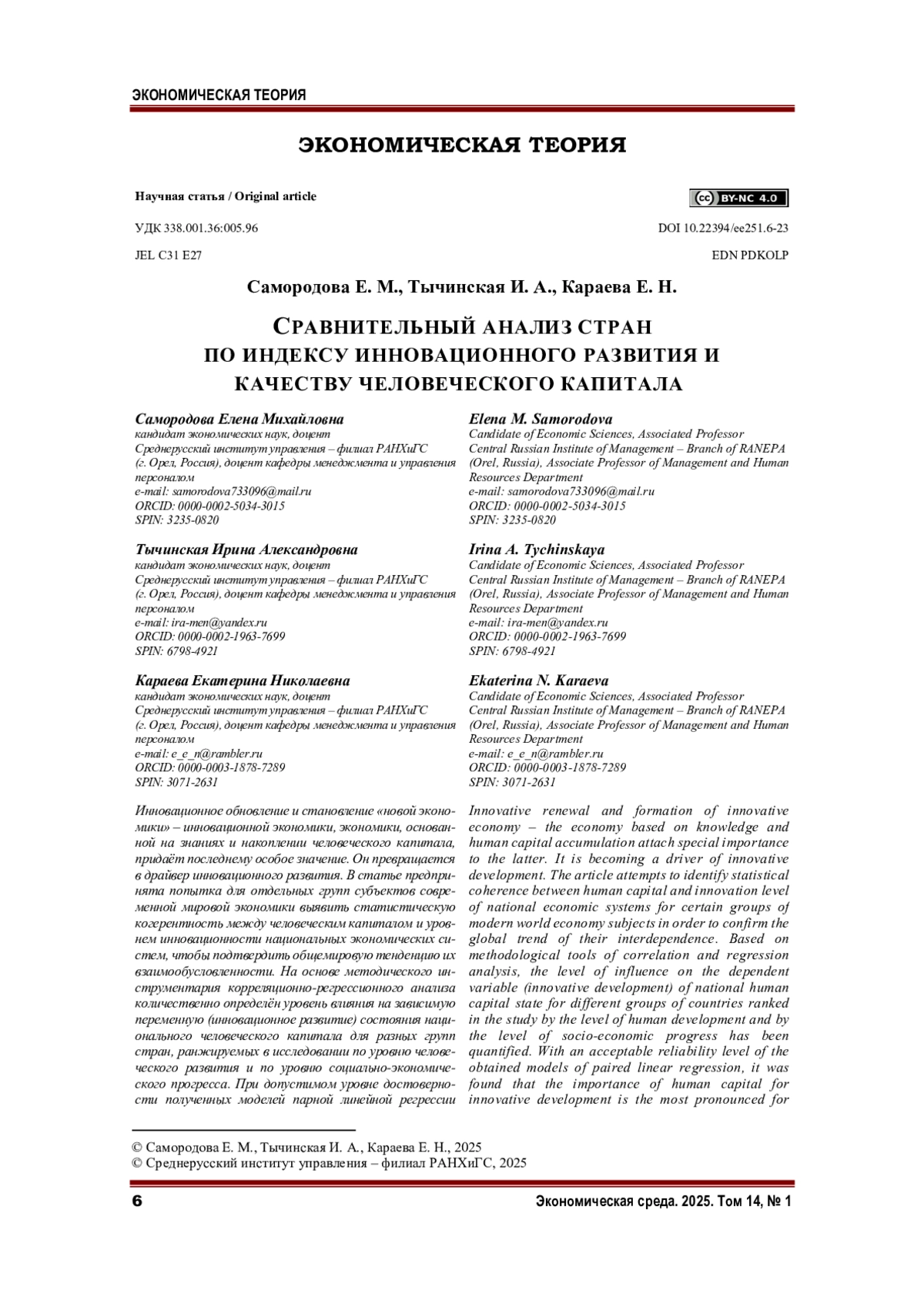 24. 	Danova, M. Educational and Innovative Elements of Human Capital and Their Impact on Economic Growth / M. Danova, E. Sira // Economy of Regions. - 2023. - Vol. 19, No. 1. - P. 111-121.  DOI: 10.17059/ekon.reg.2023-1-9  EDN: JPAZAO