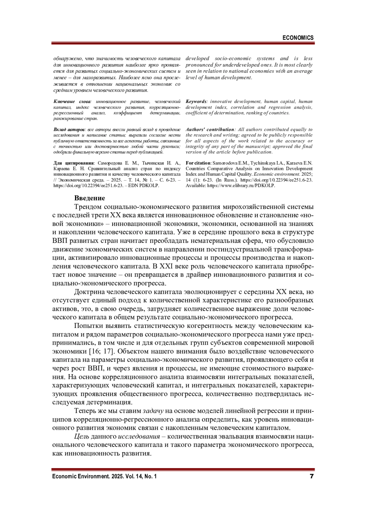 16. 	Самородова, Е. М. О роли человеческого капитала в социально-экономическом прогрессе общества (результаты корреляционного анализа) / Е. М. Самородова, Л. М. Марченкова // Креативная экономика. - 2020. - Т. 14, № 7. - С. 1325-1346.  DOI: 10.18334/ce.14.7.110591  EDN: DLZYJC