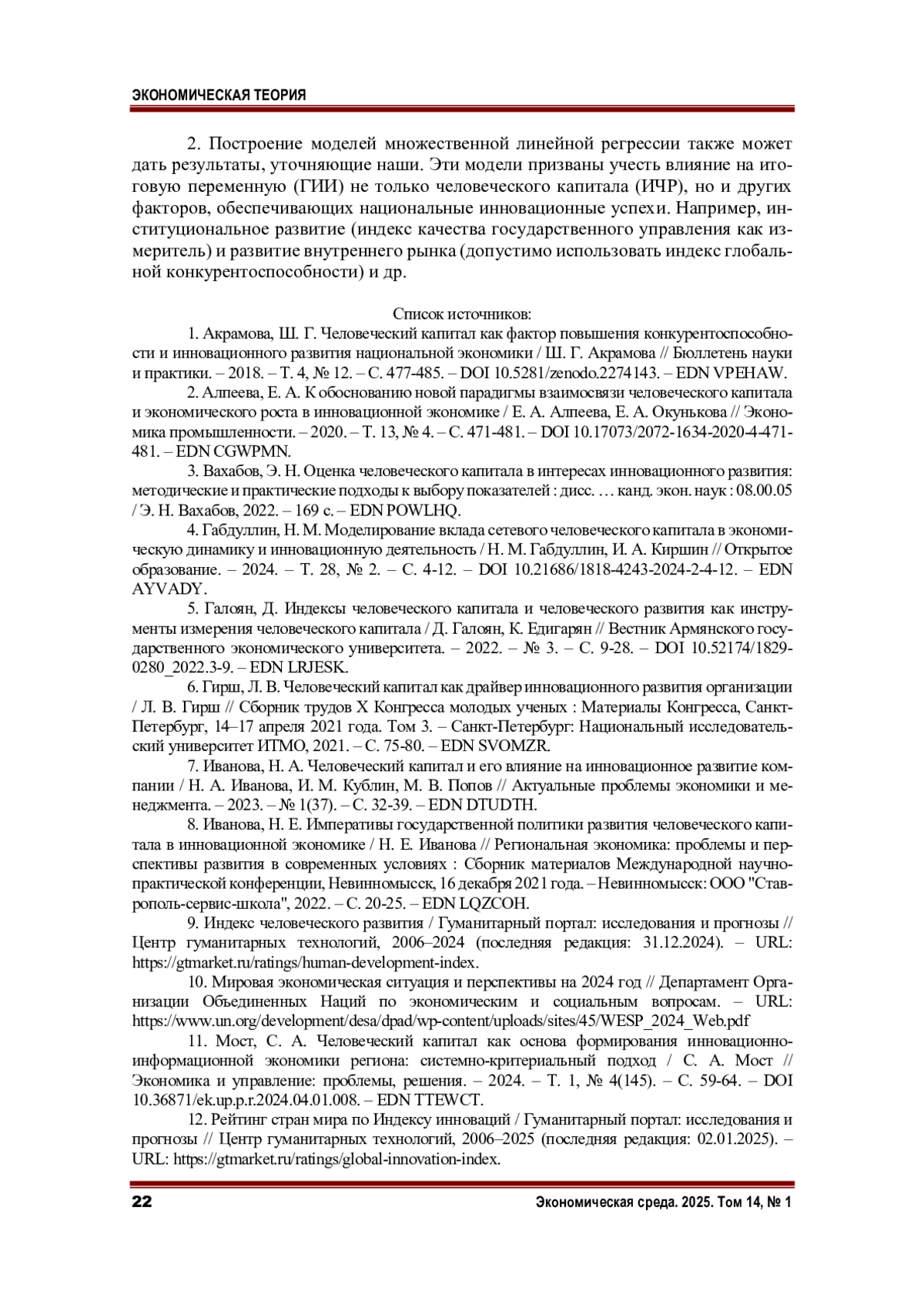 1. 	Акрамова, Ш. Г. Человеческий капитал как фактор повышения конкурентоспособности и инновационного развития национальной экономики / Ш. Г. Акрамова // Бюллетень науки и практики. - 2018. - Т. 4, № 12. - С. 477-485.  DOI: 10.5281/zenodo.2274143  EDN: VPEHAW