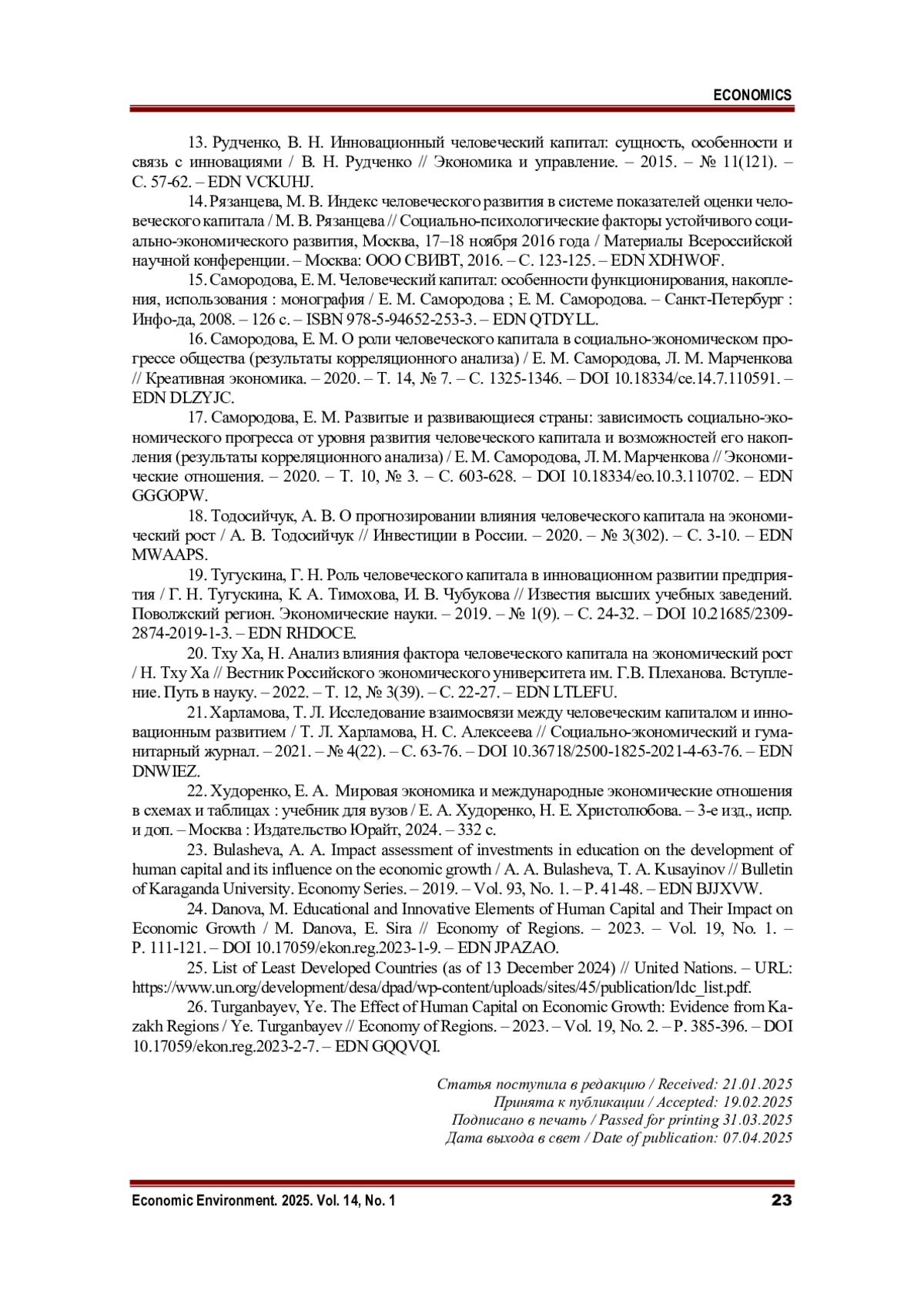 26. 	Turganbayev, Ye. The Effect of Human Capital on Economic Growth: Evidence from Kazakh Regions / Ye. Turganbayev // Economy of Regions. - 2023. - Vol. 19, No. 2. - P. 385-396.  DOI: 10.17059/ekon.reg.2023-2-7  EDN: GQQVQI