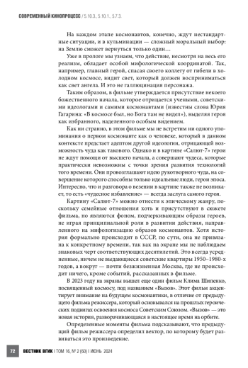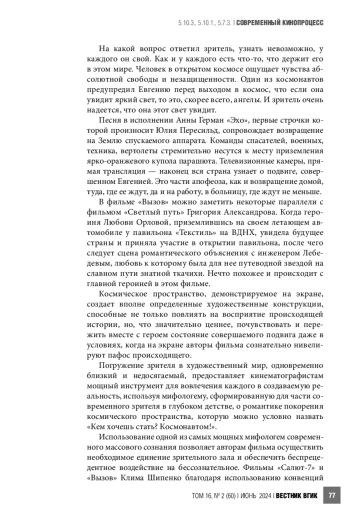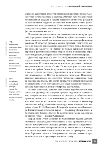 Статья посвящена анализу тематического возрождения в отечественном кинематографе тенденций позиционирования личности в социуме. Это проявляется в том числе в создании связи человека и космического пространства. На протяжении тысячелетий люди создавали миф взаимоотношений между жизнью на Земле и космосом. Этот миф создается и в настоящее время в отечественном кинематографе, который формирует социокультурную парадигму общества.