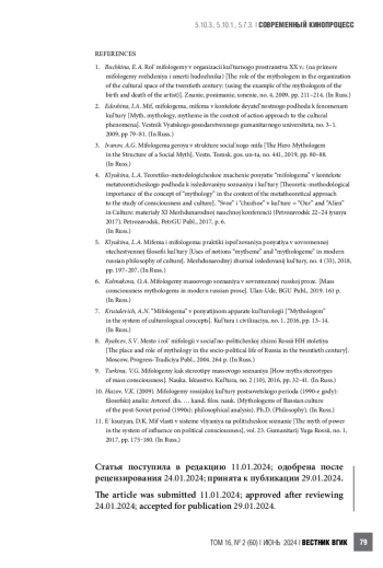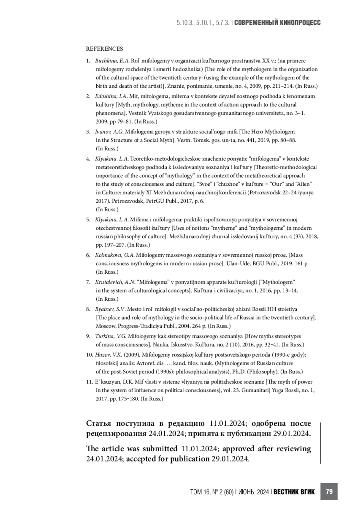 3. Иванов А.Г. Мифологема героя в структуре социального мифа // Вестн. Томск. гос. ун-та. 2019. № 441. С. 80-88.