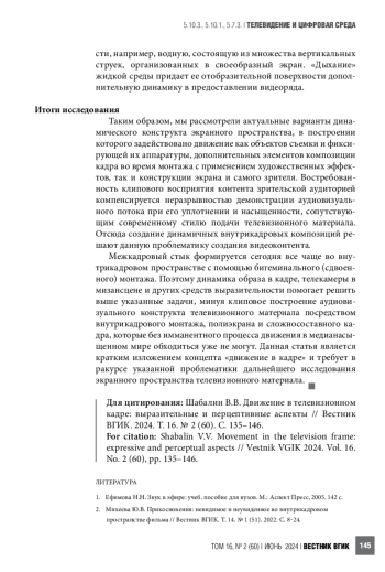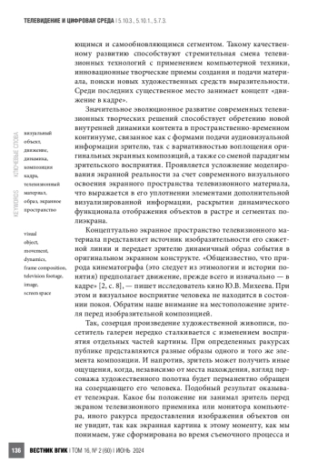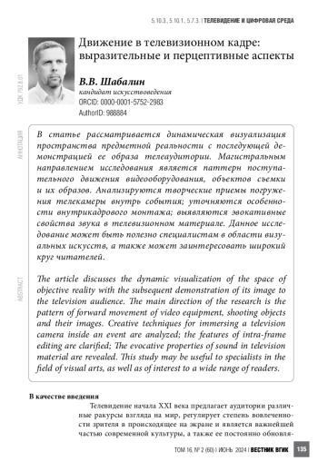 В статье рассматривается динамическая визуализация пространства предметной реальности с последующей демонстрацией ее образа телеаудитории. Магистральным направлением исследования является паттерн поступательного движения видеооборудования, объектов съемки и их образов. Анализируются творческие приемы погружения телекамеры внутрь события; уточняются особенности внутрикадрового монтажа; выявляются эвокативные свойства звука в телевизионном материале. Данное исследование может быть полезно специалистам в области визуальных искусств, а также может заинтересовать широкий круг читателей.