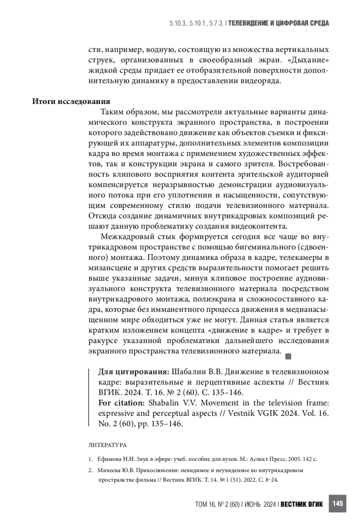 2. Михеева Ю.В. Прикосновения: невидимое и неувиденное во внутрикадровом пространстве фильма // Вестник ВГИК. Т. 14. № 1 (51). 2022. С. 8‒24.