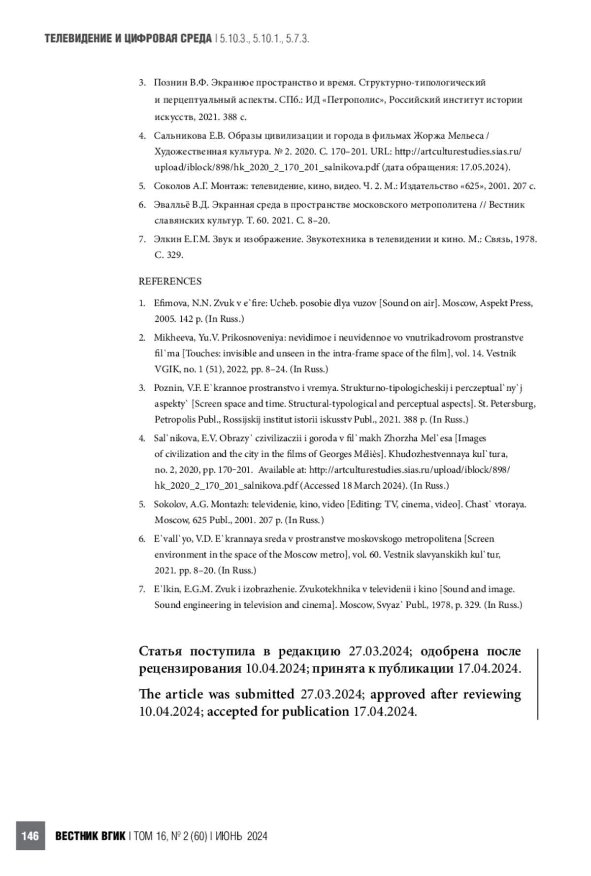 3. Познин В.Ф. Экранное пространство и время. Структурно-типологический и перцептуальный аспекты. СПб.: ИД «Петрополис», Российский институт истории искусств, 2021. 388 с.
