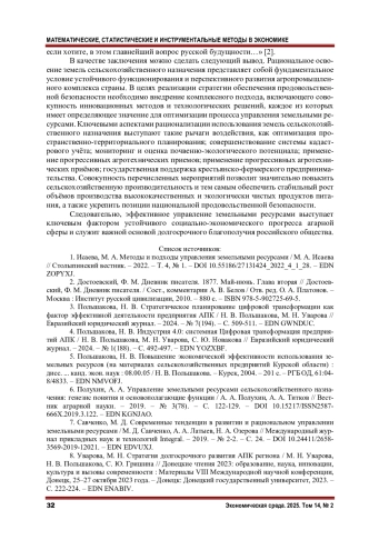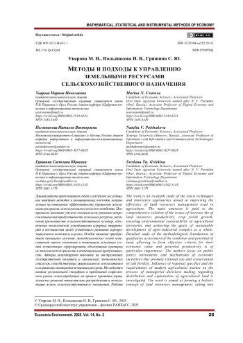 Данная работа представляет собой углублённое исследование новейших методик и инновационных подходов, направленных на повышение эффективности управления земельными ресурсами, используемыми в сельском хозяйстве. Центральное внимание уделено комплексному решению вопросов повышения продуктивности земельных ресурсов, увеличения урожайности сельскохозяйственных культур, обеспечения экологической устойчивости аграрных территорий и достижения целей устойчивого развития агропромышленного комплекса в целом. Особое значение приобретает детальное изучение методологических основ качественной оценки состояния и потенциала земельных угодий, позволяющих сформировать объективные критерии их экономической ценности и потенциальной продуктивности. Авторы акцентируют внимание на инструментах государственной политики и механизмах экономических стимулов, способствующих рациональному использованию и сохранению плодородия почвенных ресурсов. Исследуется влияние региональной специфики и требований современного рынка сельхозпродукции на процесс принятия управленческих решений относительно распределения и эксплуатации земель сельскохозяйственного назначения. Работа направлена на формирование целостной концепции управления землями сельскохозяйственного назначения, учитывающей региональные особенности и актуальные требования рынка сельскохозяйственной продукции и разработку концептуальной модели эффективного управления земельными угодьями, обеспечивающей баланс между экономическими интересами хозяйствующих субъектов и требованиями охраны окружающей среды, сохранение природного наследия и поддержание высокого уровня продовольственной безопасности страны..