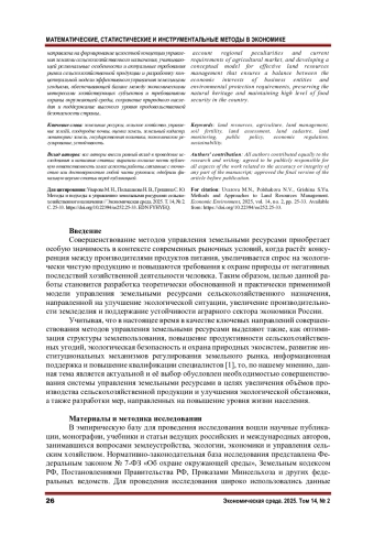 Совершенствование методов управления земельными ресурсами приобретает особую значимость в контексте современных рыночных условий, когда растёт конкуренция между производителями продуктов питания, увеличивается спрос на экологически чистую продукцию и повышаются требования к охране природы от негативных последствий хозяйственной деятельности человека. Таким образом, целью данной работы становится разработка теоретически обоснованной и практически применимой модели управления земельными ресурсами сельскохозяйственного назначения, направленной на улучшение экологической ситуации, увеличение производительности земледелия и поддержание устойчивости аграрного сектора экономики России