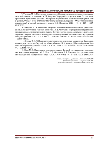 10. Чирухин, А. В. Разработка алгоритма совершенствования механизма управления земельными ресурсами в сельском хозяйстве / А. В. Чирухин // Корпоративное управление и инновационное развитие экономики Севера: Вестник Научно-исследовательского центра корпоративного права, управления и венчурного инвестирования Сыктывкарского государственного университета. - 2022. - Т. 2, № 4. - С. 456-464. DOI: 10.34130/2070-4992-2022-2-4-456 EDN: UYRSEJ