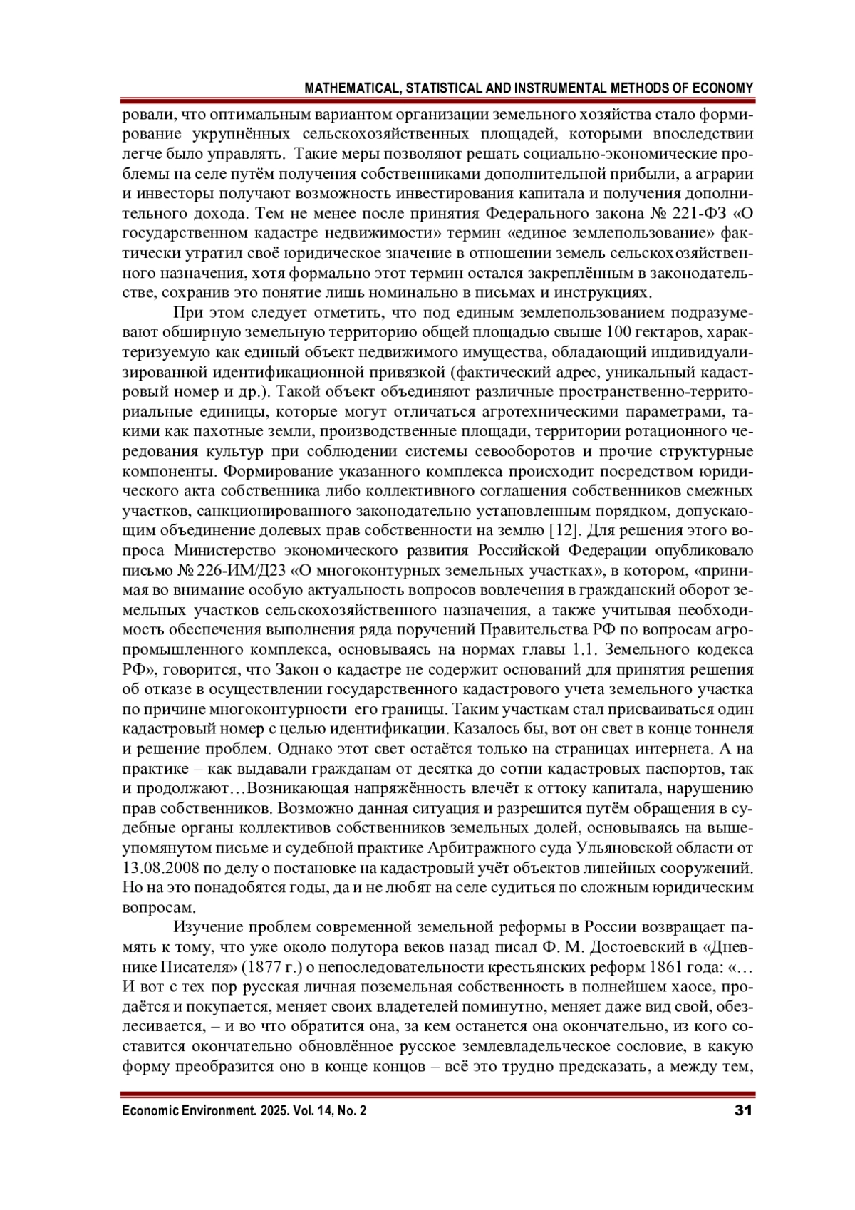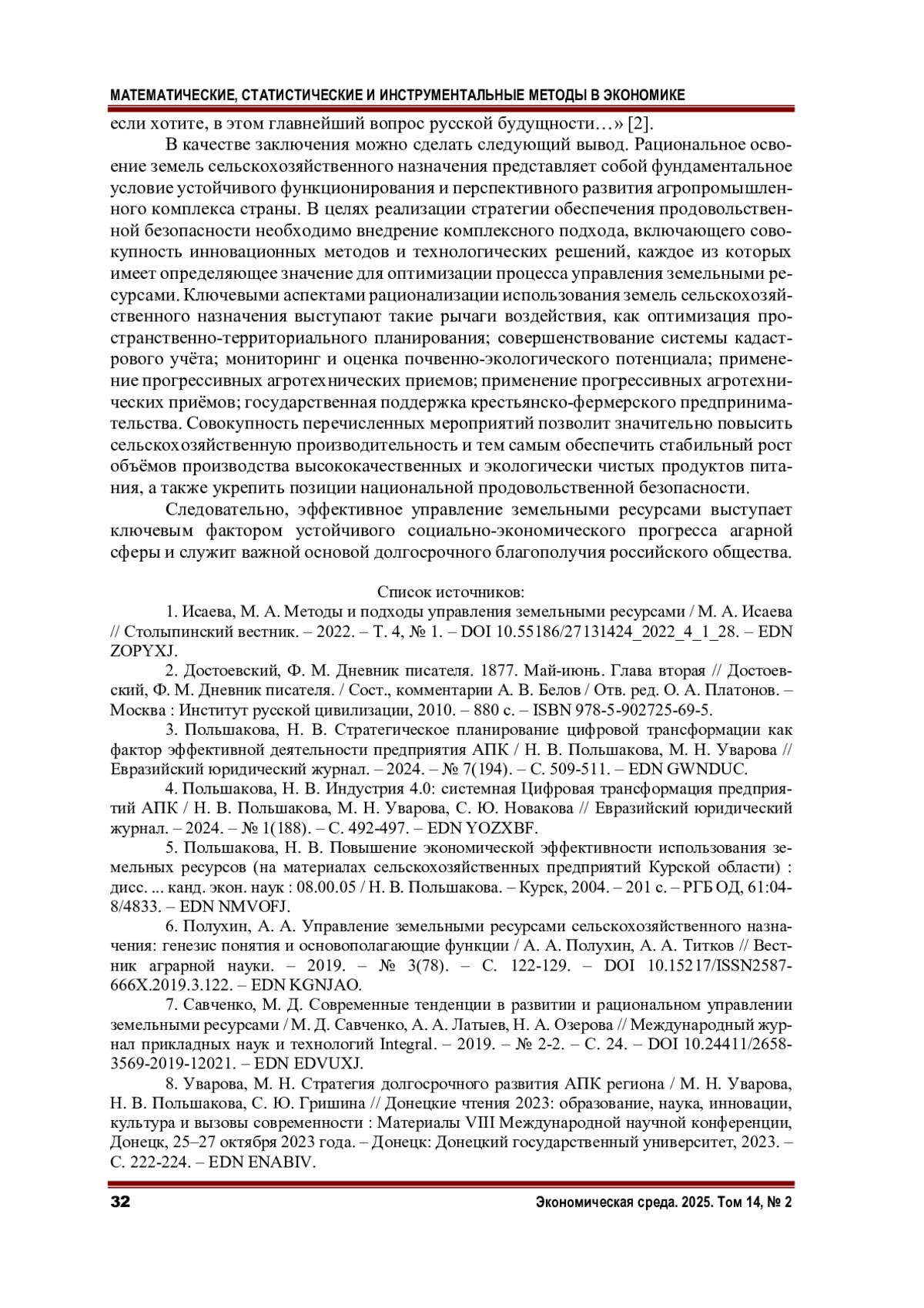 6. Полухин, А. А. Управление земельными ресурсами сельскохозяйственного назначения: генезис понятия и основополагающие функции / А. А. Полухин, А. А. Титков // Вестник аграрной науки. - 2019. - № 3(78). - С. 122-129. DOI: 10.15217/ISSN2587-666X.2019.3.122 EDN: KGNJAO