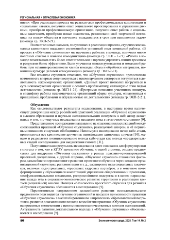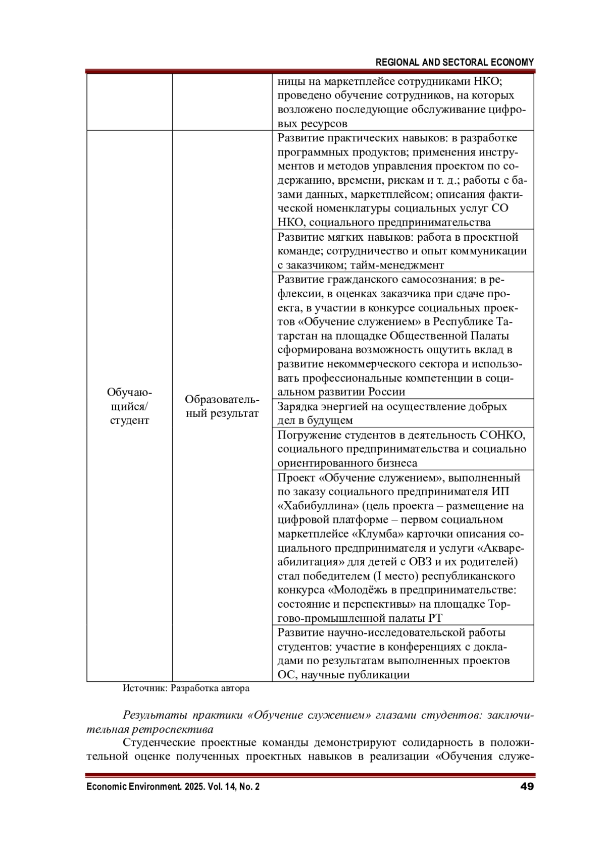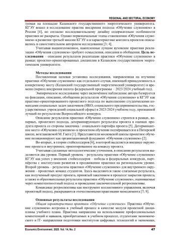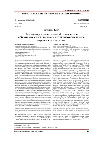 В статье представлены результаты эмпирического исследования оценки опыта реализации «Обучения служением» как практико-ориентированного проектного подхода по выполнению студенческими командами социальных задач заказчиков (НКО, социального предпринимательства, государственных учреждений социальной сферы, социально ориентированного бизнеса). Объект исследования - КГЭУ. Методы исследования - оценка практики «Обучение служением» в рамках проектного подхода и теории стейкхолдеров, в частности через продукт проекта и образовательный результат, выявляемый в ретроспективе методом рефлексии «Уроки реализации проекта». Результаты исследования: выявлена включённость «Обучения служением» в проектное обучение, что оказывает взаимные двухсторонние эффекты на их развитие. В частности, «Обучение служением» наполняет проектную деятельность социальной значимостью и результативностью; формирует у студентов мягкие компетенции управления проектами (управление командой и временем, взаимодействия с заказчиками и стейкхолдерами, ведение переговоров и т. д.); вызывает интерес и одобряемый отклик у студентов в формировании духовно-нравственных ценностей в служении некоммерческому сектору. Практическая значимость: результаты исследования доведены до уровня конкретизации и могут быть использованы в оперативной корректировке стратегии реализации федеральной программы «Обучение служением», вносят вклад в первичное научное осмысление имеющихся практик «Обучения служением».