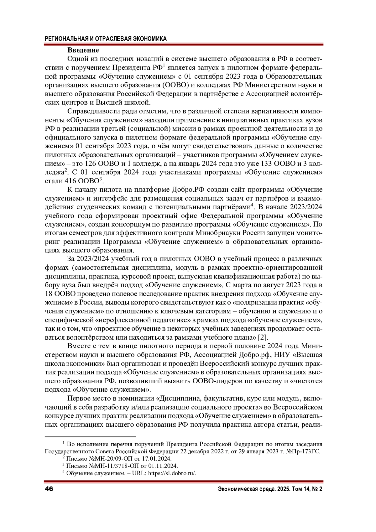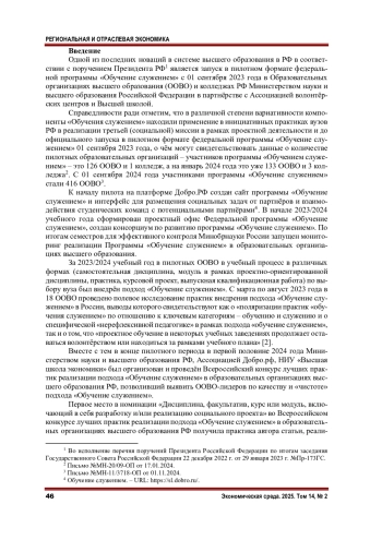 Одной из последних новаций в системе высшего образования в РФ в соответствии с поручением Президента РФ1 является запуск в пилотном формате федеральной программы «Обучение служением» с 01 сентября 2023 года в Образовательных организациях высшего образования (ООВО) и колледжах РФ Министерством науки и высшего образования Российской Федерации в партнёрстве с Ассоциацией волонтёрских центров и Высшей школой