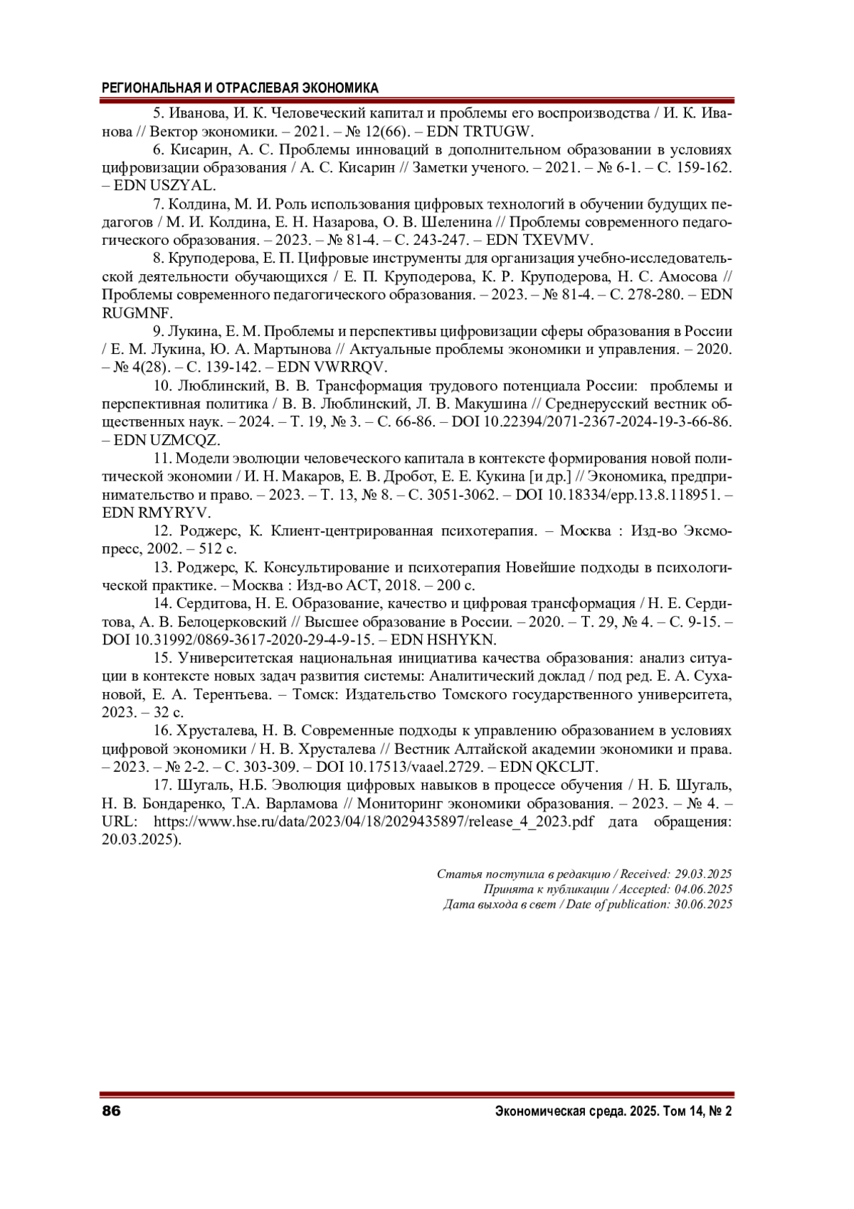 16. Хрусталева, Н. В. Современные подходы к управлению образованием в условиях цифровой экономики / Н. В. Хрусталева // Вестник Алтайской академии экономики и права. - 2023. - № 2-2. - С. 303-309. DOI: 10.17513/vaael.2729 EDN: QKCLJT