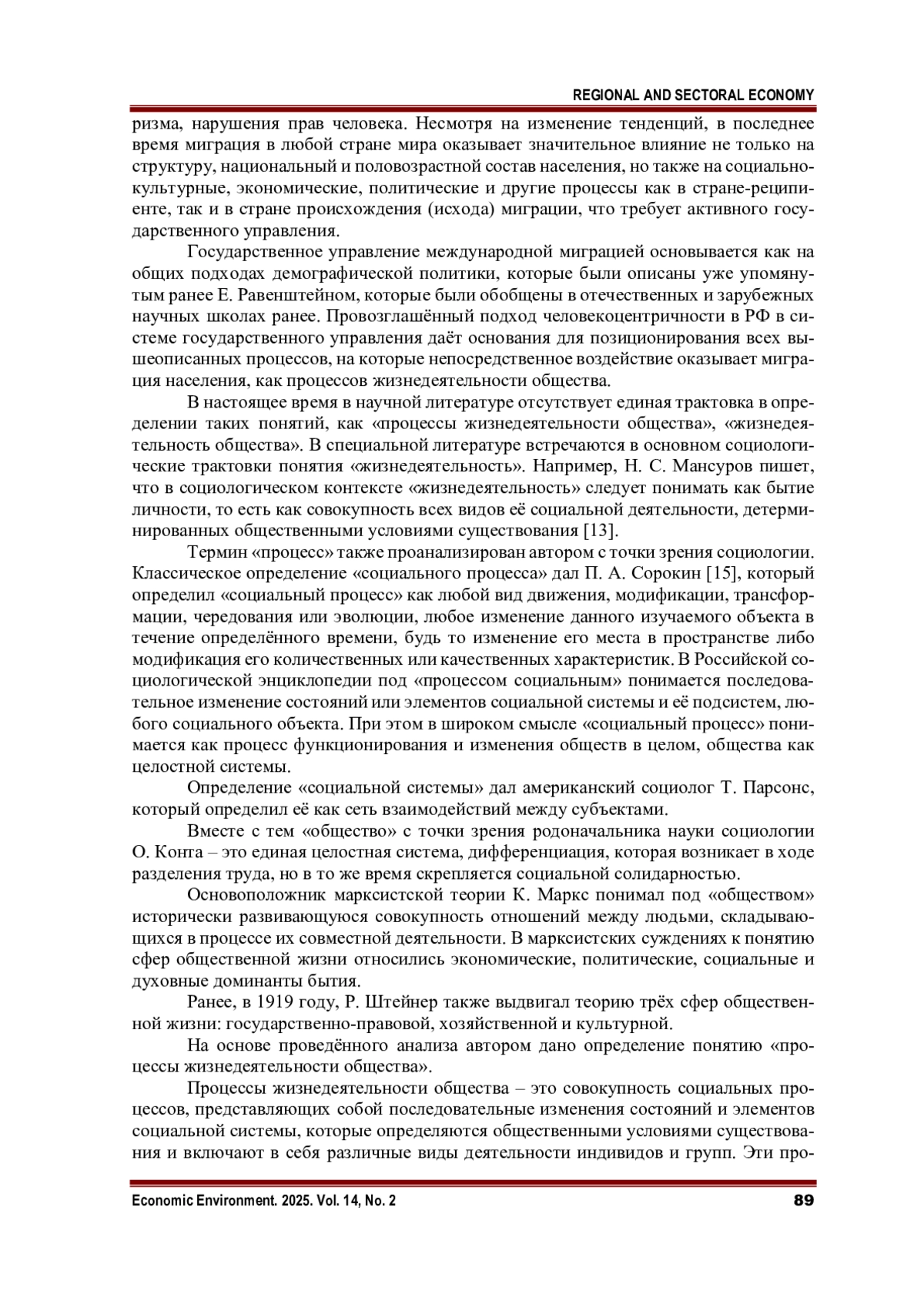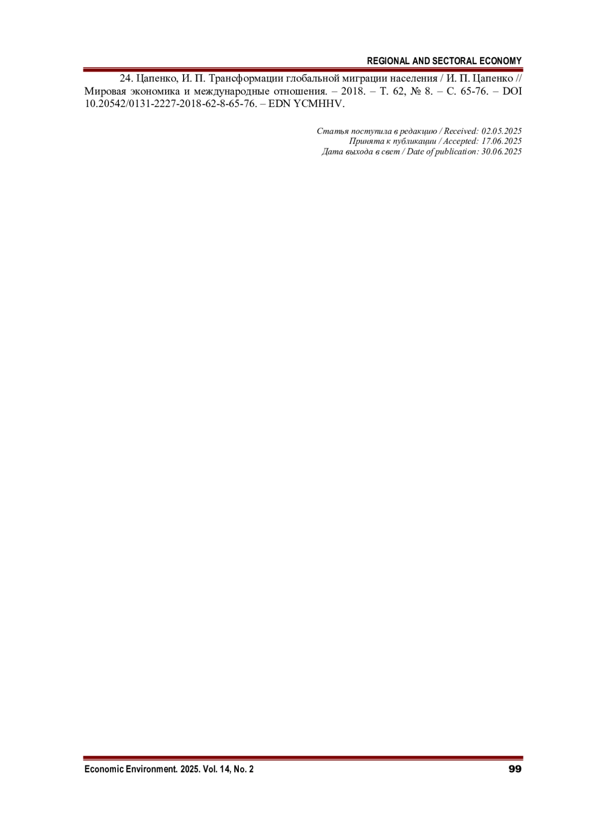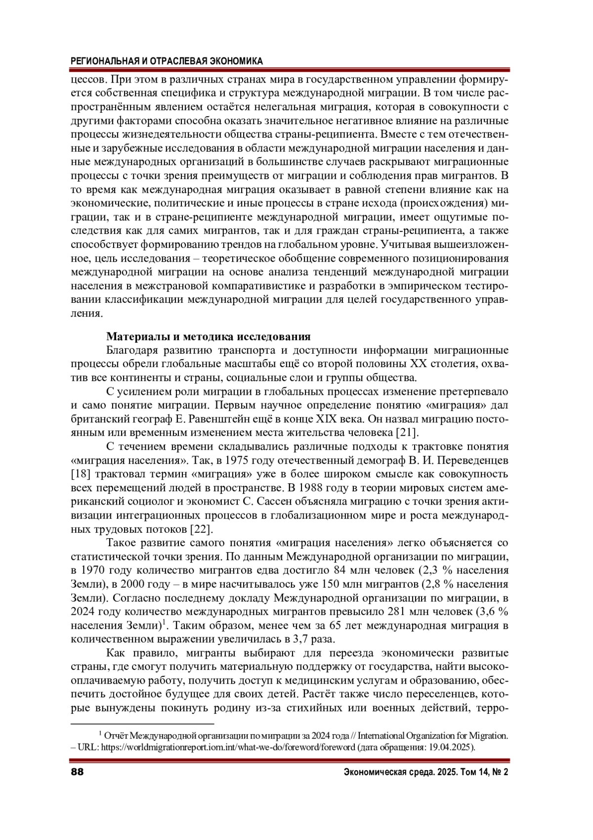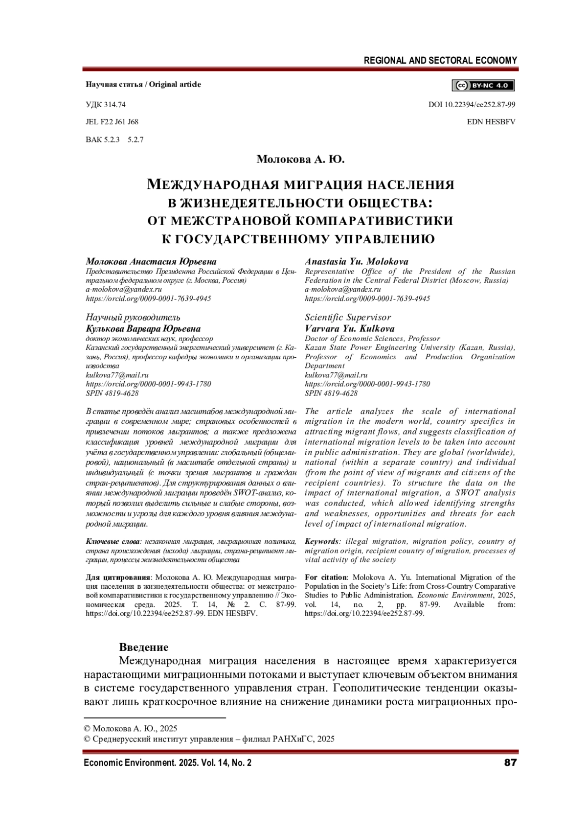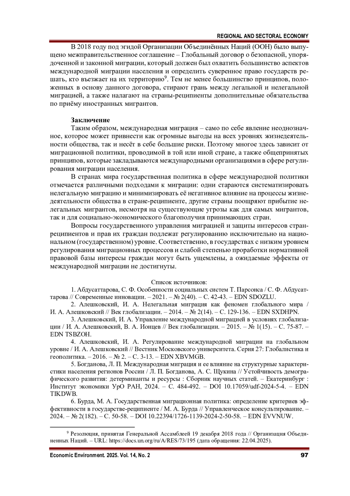 МОЛОКОВА А. Ю. МЕЖДУНАРОДНАЯ МИГРАЦИЯ НАСЕЛЕНИЯ В ЖИЗНЕДЕЯТЕЛЬНОСТИ ОБЩЕСТВА: ОТ МЕЖСТРАНОВОЙ КОМПАРАТИВИСТИКИ К ГОСУДАРСТВЕННОМУ УПРАВЛЕНИЮ // ЭКОНОМИЧЕСКАЯ СРЕДА. 2025. Т. 14 № 2