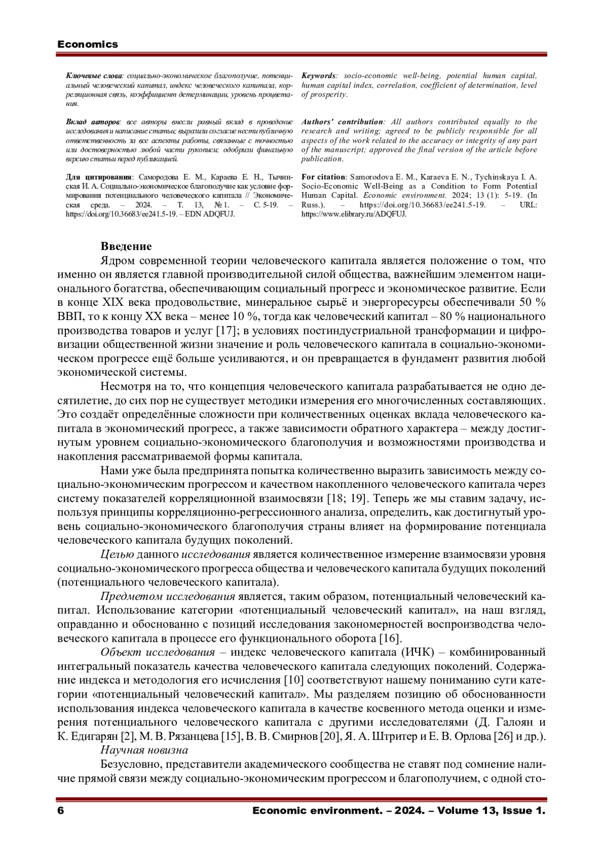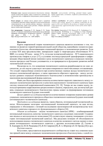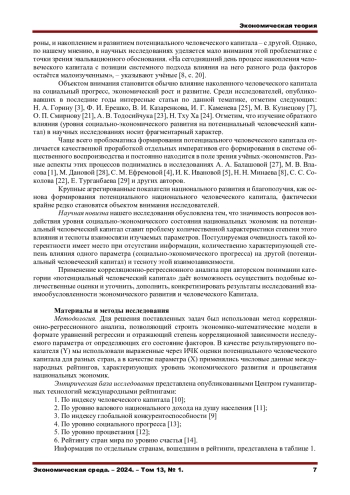 Материалы статьи являются продолжением серии исследований авторов, посвящённых изучению тесноты корреляционной взаимосвязи уровня социально-экономического развития стран и развития национального человеческого капитала. В настоящей статье объектом внимания является количественная взаимосвязь между уровнем социально-экономического благополучия страны и потенциалом развития будущего человеческого капитала. На основе авторской трактовки понятия «потенциальный человеческий капитал» с позиций корреляционно-регрессионного анализа рассматривается влияние параметров социально-экономического благополучия на сегодняшние возможности формирования и реализации человеческого капитала будущих поколений. В рамках методического инструментария регрессионного анализа на основе расчётов коэффициентов корреляции предпринята попытка выразить количественно степень влияния на зависимую переменную (потенциальный человеческий капитал) различных параметров социально-экономического благополучия стран: дохода на душу населения, нестоимостных характеристик общественного развития (конкурентоспособность национальной экономики, уровень социального прогресса, уровень процветания, уровень счастья).