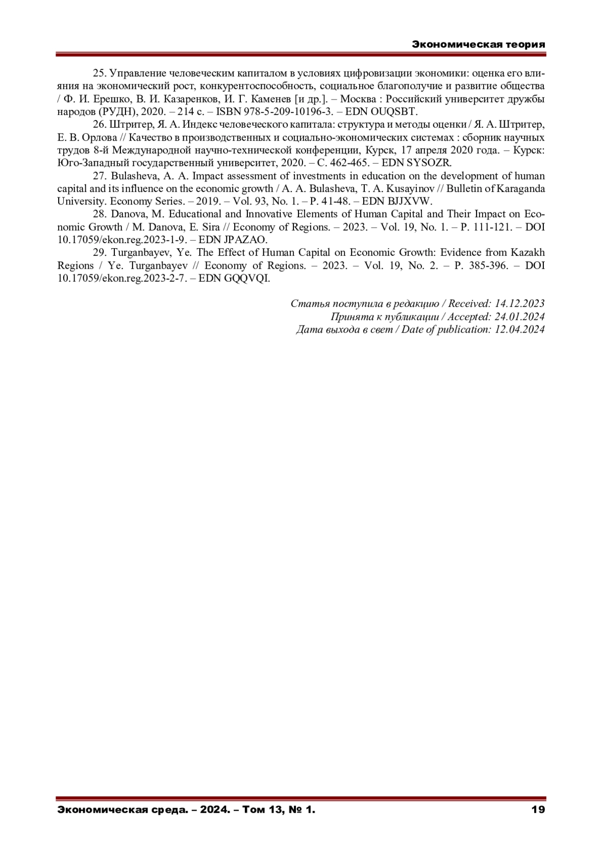 29. Turganbayev, Ye. The Effect of Human Capital on Economic Growth: Evidence from Kazakh Regions / Ye. Turganbayev // Economy of Regions. - 2023. - Vol. 19, No. 2. - P. 385-396. DOI: 10.17059/ekon.reg.2023-2-7 EDN: GQQVQI