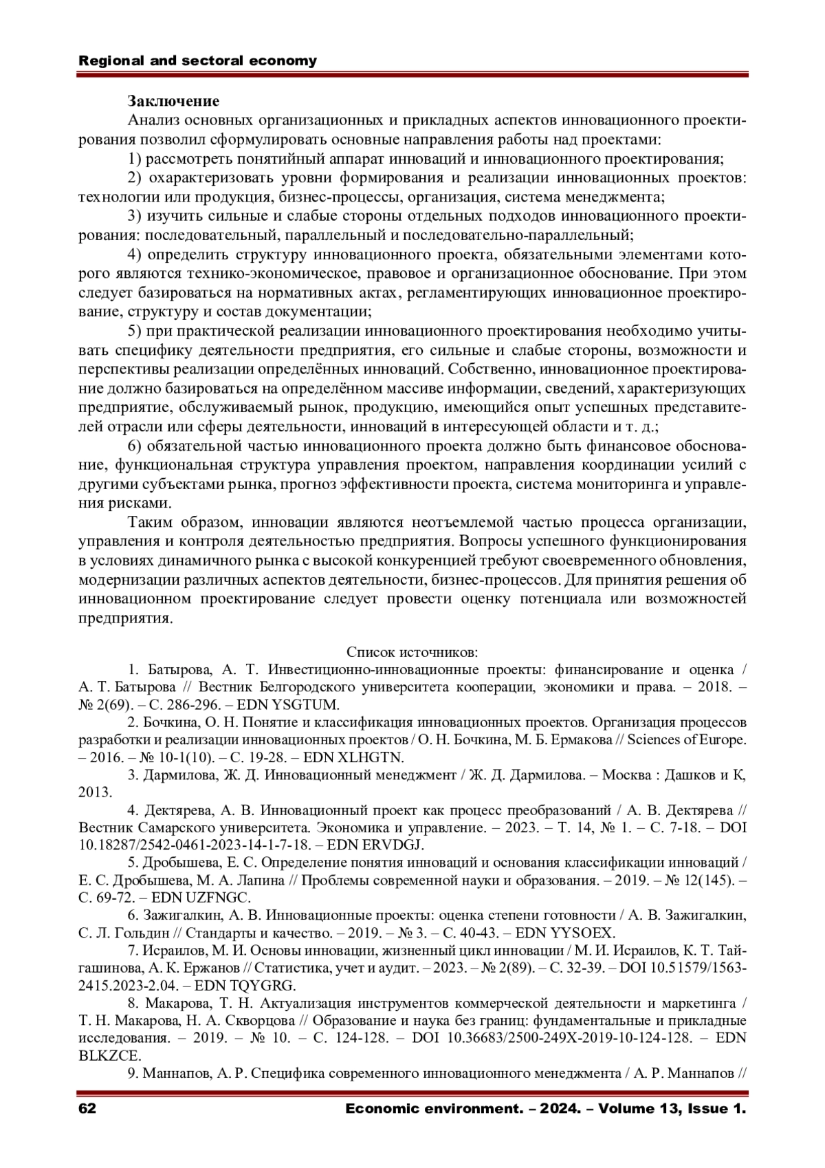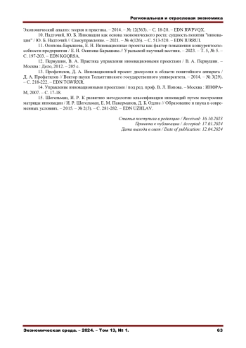4. Дектярева, А. В. Инновационный проект как процесс преобразований / А. В. Дектярева // Вестник Самарского университета. Экономика и управление. - 2023. - Т. 14, № 1. - С. 7-18. DOI: 10.18287/2542-0461-2023-14-1-7-18 EDN: ERVDGJ