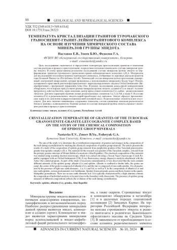 Цель исследования заключается в определении температуры кристаллизации гранитов и изменения состава расплава в процессе кристаллизации, посредством изучения химического состава минералов группы эпидота. В статье представлены результаты исследования состава минералов группы эпидота из порфировидных гранитов турочакского граносиенит-гранит-лейкогранитового комплекса (γD1t). Материалом для исследований послужили граниты турочакского комплекса, отобранные из коренных выходов гранитов горы Большой Иконостас (Республика Алтай). Химический состав минералов изучен при помощи сканирующей электронной микроскопии, которая проводилась с использованием микроскопа Tescan Vega3 (Чехия), оснащенного приставкой рентгенофлуорисцентного энергодисперсионного анализа Oxford Instruments (Великобритания) с программой управления Aztec One. В рамках исследования акцессорной минерализации обнаружено, что в породах присутствуют разные минералы группы эпидота: алланит-(Се) и эпидот. Алланит приурочен к лейстам биотита, зерна зональны, центр зерна сложен алланитом-(Се), кайма - редкоземельным эпидотом. Для него характерно наличие легких редкоземельных элементов: La, Ce и Nd, а также Y. В составе алланита-(Се) и редкоземельного эпидота церий преобладает над лантаном. Эпидот образует призматические зерна и их скопления в кварц-полевошпатовой основной массе. Редкоземельные элементы в нем отсутствуют. Для него типично повышенное содержание глинозема, состав единичных анализов располагается близко к границе с клиноцоизитом. Наличие разных по составу минералов группы эпидота отражает эволюцию расплава в процессе кристаллизации.