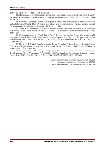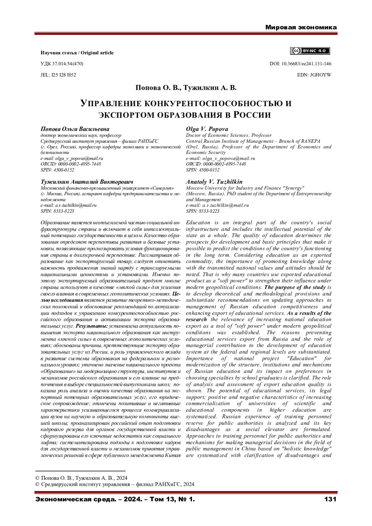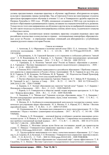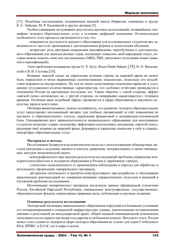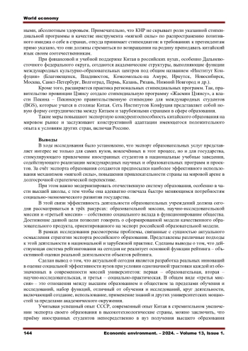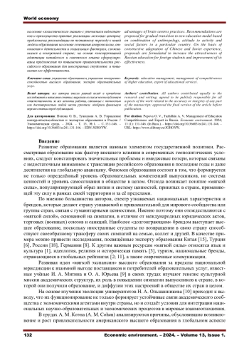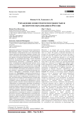 ПОПОВА О. В., ТУЖИЛКИН А. В. УПРАВЛЕНИЕ КОНКУРЕНТОСПОСОБНОСТЬЮ И ЭКСПОРТОМ ОБРАЗОВАНИЯ В РОССИИ // ЭКОНОМИЧЕСКАЯ СРЕДА. 2024. Т. 13 № 1