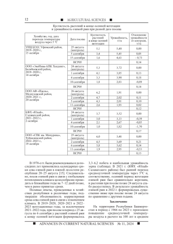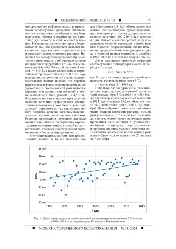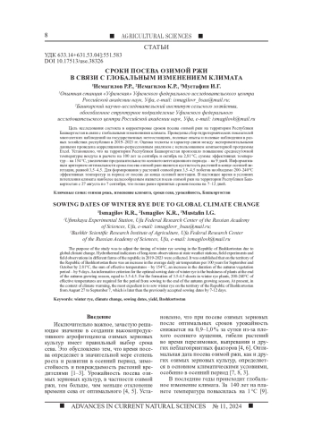 Цель исследования состояла в корректировке сроков посева озимой ржи на территории Республики Башкортостан в связи с глобальными изменениями климата. Проведены сбор гидротермических показателей многолетних наблюдений на государственных метеостанциях, полевые опыты и полевые наблюдения в разных хозяйствах республики в 2019-2023 гг. Оценка тесноты и характер связи между экспериментальными данными проведена корреляционно-регрессионным анализом с использованием компьютерной программы Excel. Установлено, что на территории Республики Башкортостан произошло повышение среднесуточной температуры воздуха в расчете на 100 лет за сентябрь и октябрь на 2,81 °С, суммы эффективных температур - на 154 °С, увеличение продолжительности осеннего вегетационного периода - на 9 дней. Информативным критерием оптимальности срока посева озимой ржи является кустистость растений в конце осенней вегетации, равной 3,5-4,5. Для формирования у растений озимой ржи 3,5-4,5 побегов необходимо 200-240 ºС эффективных температур за период от посева до конца осенней вегетации. В настоящее время в условиях потепления климата наиболее целесообразным является посев озимой ржи на территории Республики Башкортостан с 27 августа по 7 сентября, что позже ранее принятых сроков посева на 7-12 дней.