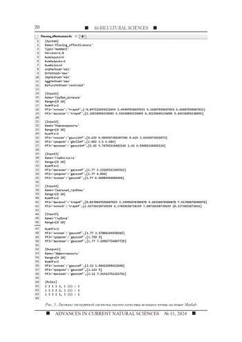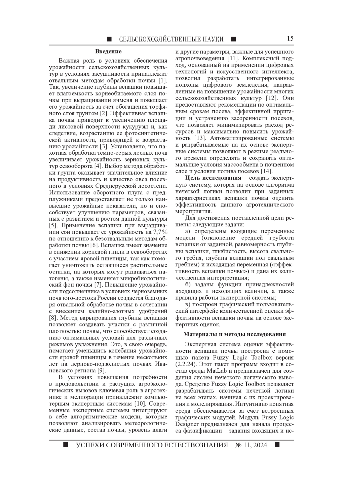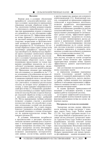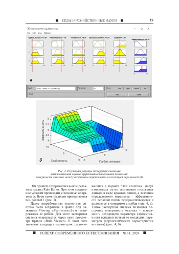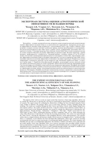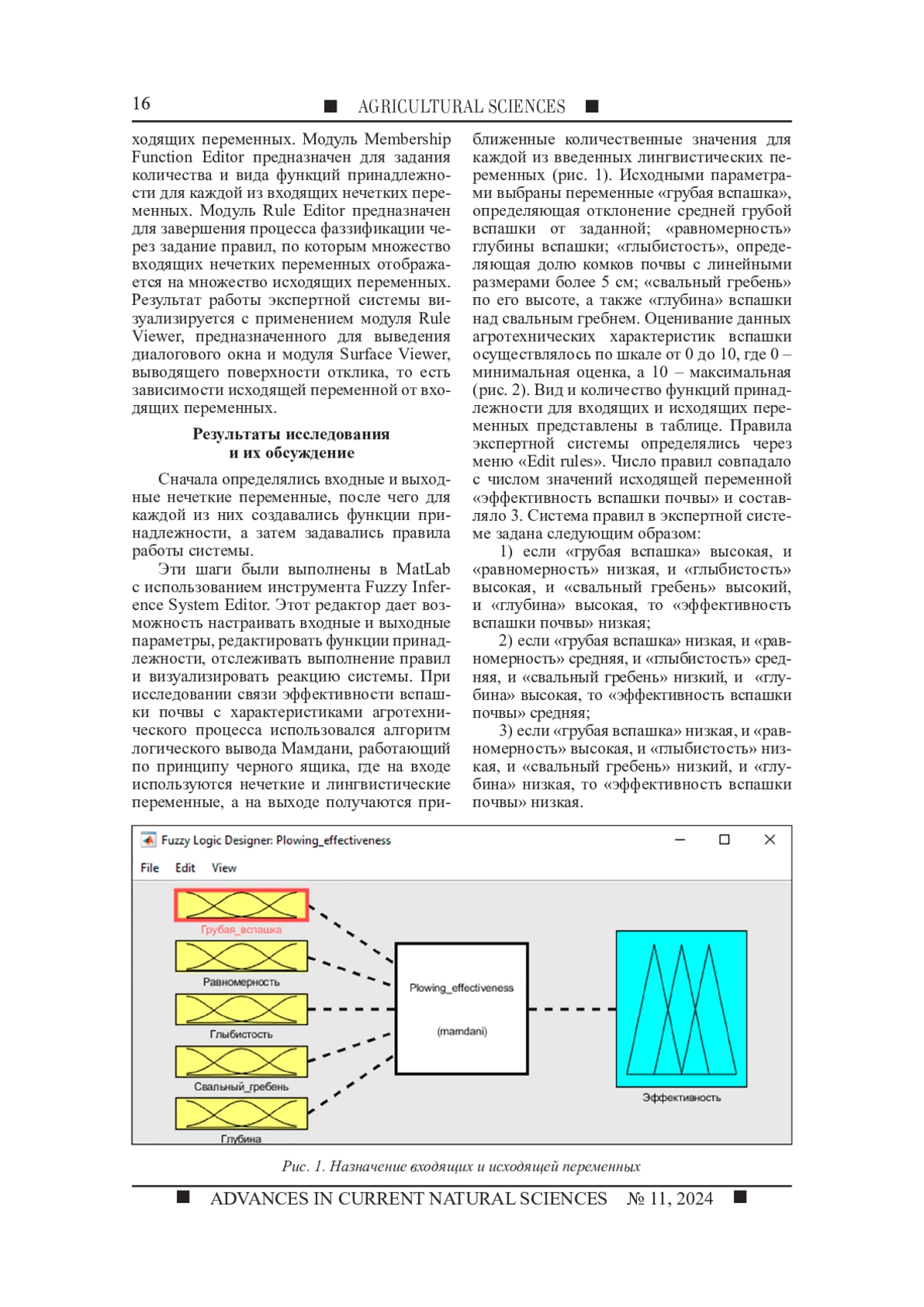 Цель работы - создание экспертной системы, которая на основе алгоритма нечеткой логики позволяет оценить эффективность вспашки почвы от ее агротехнических характеристик. Экспертная система оценки эффективности вспашки почвы разработана с использованием Fuzzy Logic Toolbox в MatLab. Пакет позволяет создавать системы нечеткого логического вывода, включая проектирование и моделирование. Результаты визуализируются через Rule Viewer и Surface Viewer, отображающие диалоговые окна и поверхности отклика. С помощью редактора Fuzzy Inference System Editor была создана экспертная система на основе алгоритма Мамдани для оценки эффективности вспашки почвы. Входные параметры: «грубая вспашка», «равномерность», «глыбистость», «свальный гребень», «глубина» (оценка от 0 до 10). В отношении этих величин заданы функции принадлежности и три правила соответствия, определяющие значение эффективности вспашки почвы от входящих характеристик. Система тестировалась через Rule Viewer, показывая зависимость величины эффективности вспашки от входящих параметров. Поверхность отклика обнаруживает ступенчатую структуру и резко возрастает при увеличении глыбистости выше 7 и свального гребня выше 5. Разработан пользовательский интерфейс, реализующий систему нечеткой логики для оценки экологического риска на основе экспертных оценок показателей качества окружающей среды. Система интегрируется в Simulink и может работать как независимое приложение. Интерфейс интуитивно понятен и позволяет вводить данные и получать результаты быстро. Алгоритмы нечеткой логики позволяют обрабатывать неточные данные, обеспечивая надежные прогнозы и рекомендации по агротехническим процессам. Интеграция с Simulink способствует комплексному подходу к управлению сельскохозяйственными процессами. Система легко расширяется за счет модулей и адаптируется к условиям и требованиям, улучшая оценку и прогнозируя в контексте мелиорации.