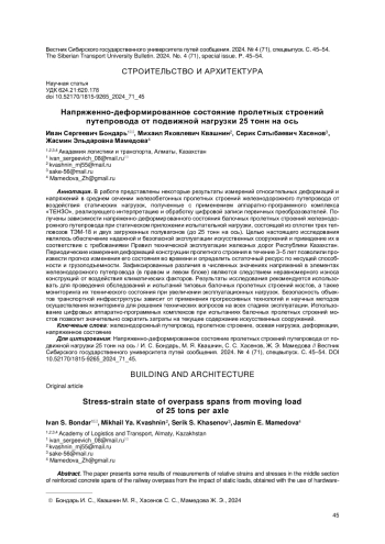 Статья: НАПРЯЖЕННО-ДЕФОРМИРОВАННОЕ СОСТОЯНИЕ ПРОЛЕТНЫХ СТРОЕНИЙ ПУТЕПРОВОДА ОТ ПОДВИЖНОЙ НАГРУЗКИ 25 ТОНН НА ОСЬ (2024)
