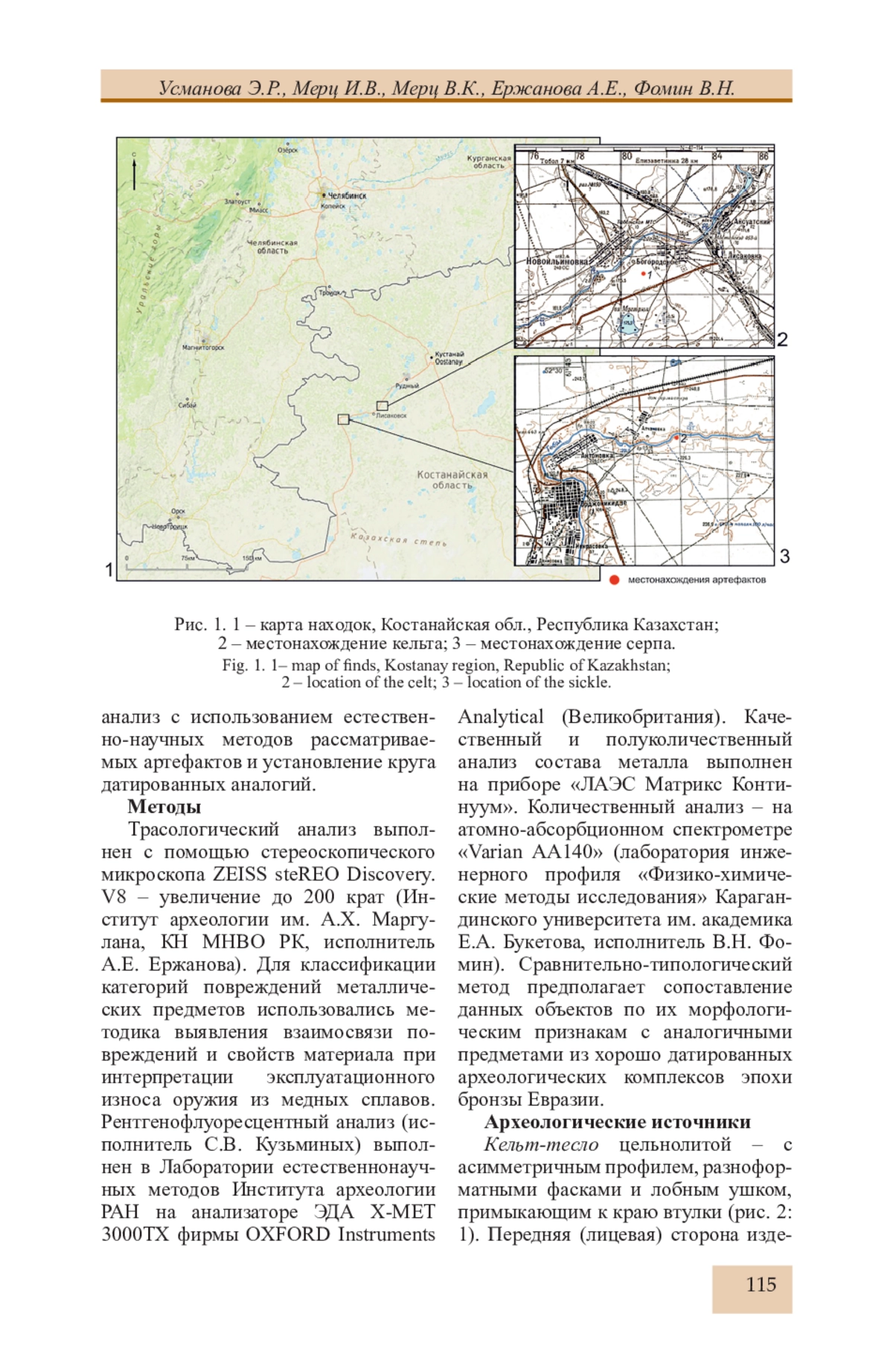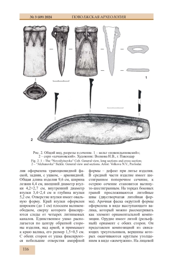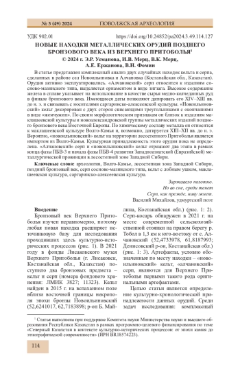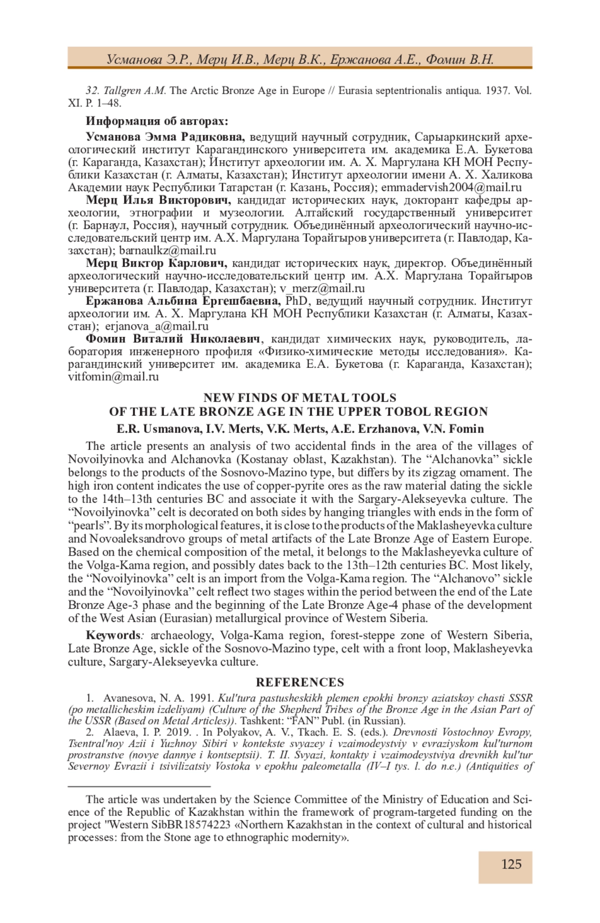 В статье представлен комплексный анализ двух случайных находок кельта и серпа, сделанных в районе сел Новоильиновка и Алчановка (Костанайская обл., Казахстан). Орудия активно эксплуатировались. «Алчановский» серп относится к изделиям сосново-мазинского типа, выделяется орнаментом в виде зигзага. Высокое содержание железа в сплаве указывает на использование в качестве сырья медно-колчеданных руд в финале бронзового века. Имеющиеся даты позволяют датировать его XIV-XIII вв. до н. э. и связывать с носителями саргаринско-алексеевской культуры. «Новоильиновский» кельт декорирован с двух сторон свисающими треугольниками с окончаниями в виде «жемчужин». По своим морфологическим признакам он близок к изделиям маклашеевской культуры и новоалександровской группы металлических изделий позднего бронзового века Восточной Европы. По химическому составу металла он относится к маклашеевской культуре Волго-Камья и, возможно, датируется XIII-XII вв. до н. э. Вероятно, «новоильиновский» кельт на территории лесостепного Притоболья является импортом из Волго-Камья. Культурная принадлежность этого орудия пока не определена. «Алчановский» серп и «новоильиновский» кельт отражают два этапа в рамках конца фазы ПБВ-3 и начала фазы ПБВ-4 развития Западноазиатской (Евразийской) металлургической провинции в лесостепной зоне Западной Сибири.