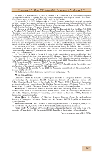 24. Мерц И.В., Усманова Э.Р. Знаки на артефактах позднего бронзового века из поселения Бозшаколь 1 // Воякин Д.А., Усманова Э.Р. Горно-металлургический комплекс Бозшаколь 1 (эпоха финальной бронзы). Алматы: МИЦАИ, 2023. С. 209-214.